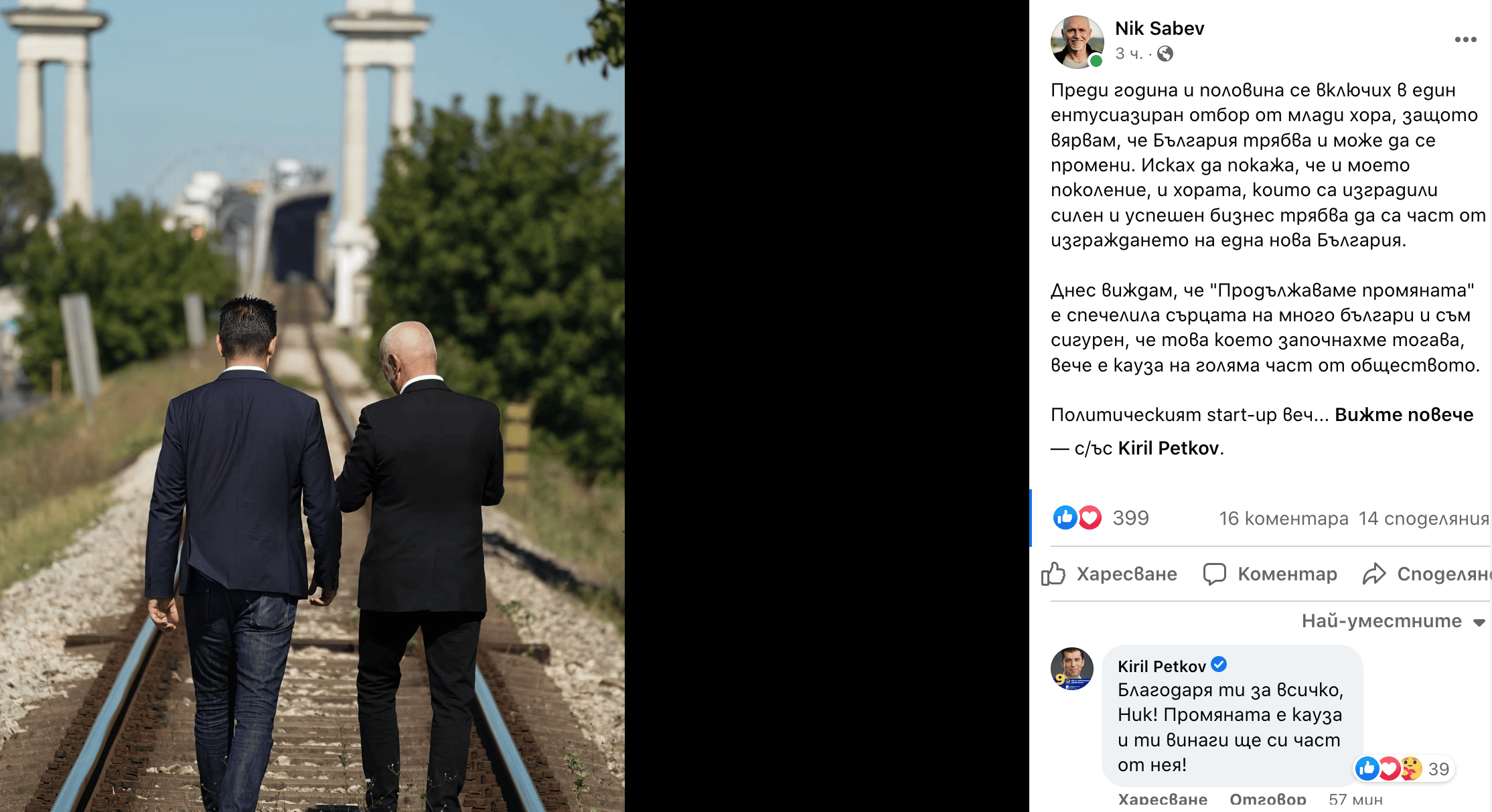Бившият премиер и съпредседател на формацията Кирил Петков се сбогува с бившия си спонсор отново в социалните мрежи, където в отговор на публикацията написа: „Благодаря ти за всичко, Ник! Промяната е кауза и ти винаги ще си част от нея“.
