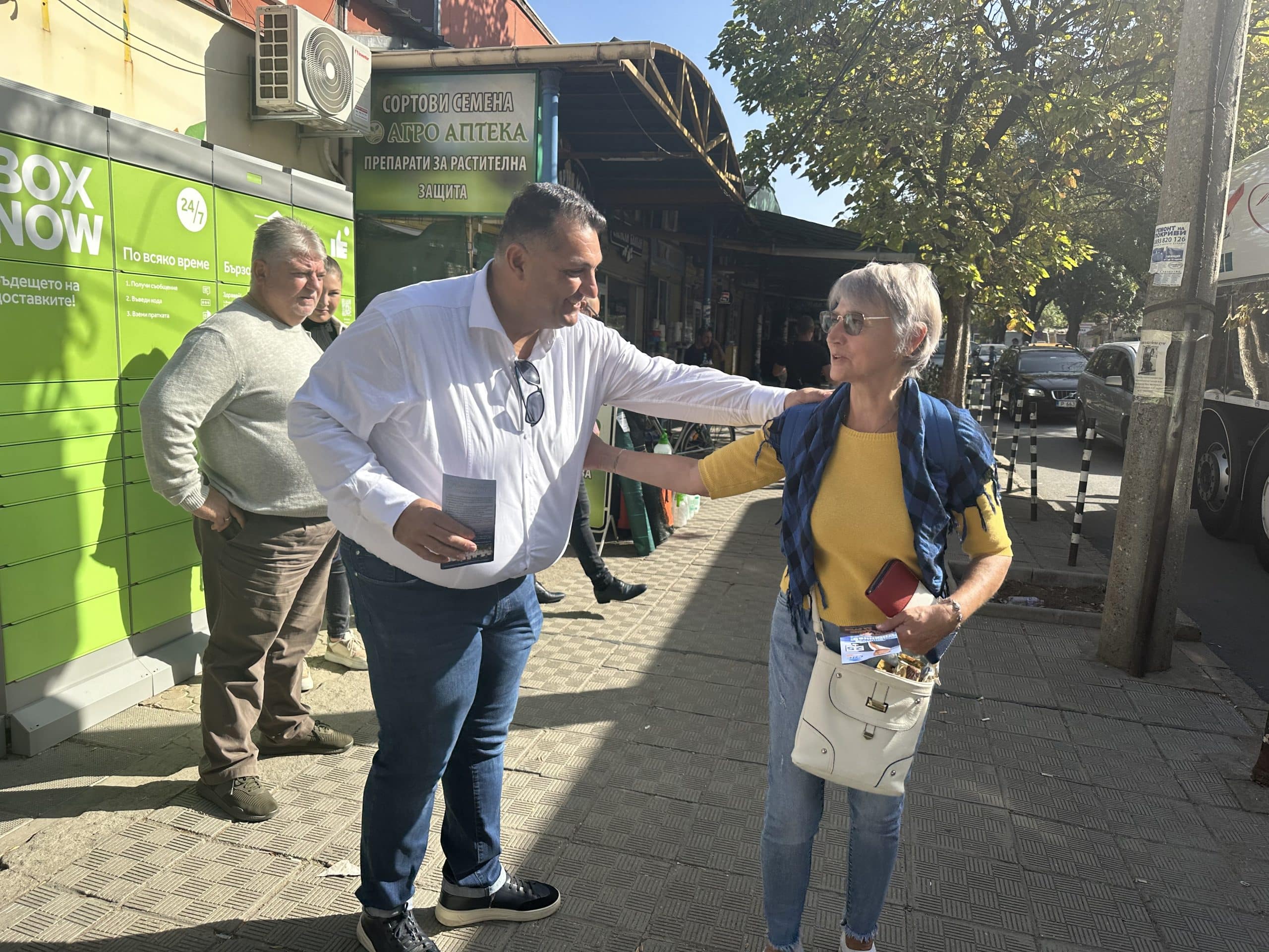 Кандидатът за кмет и водач на листата с общински съветници Станимир Станчев и част от екипа му бяха на едно от най-оживените места в града – Централният кооперативен пазар. Търговците и посетителите споделиха проблемите си, задаваха въпроси и научиха повече за Станимир Станчев, за неговата личност и мотивацията му да служи на общността.