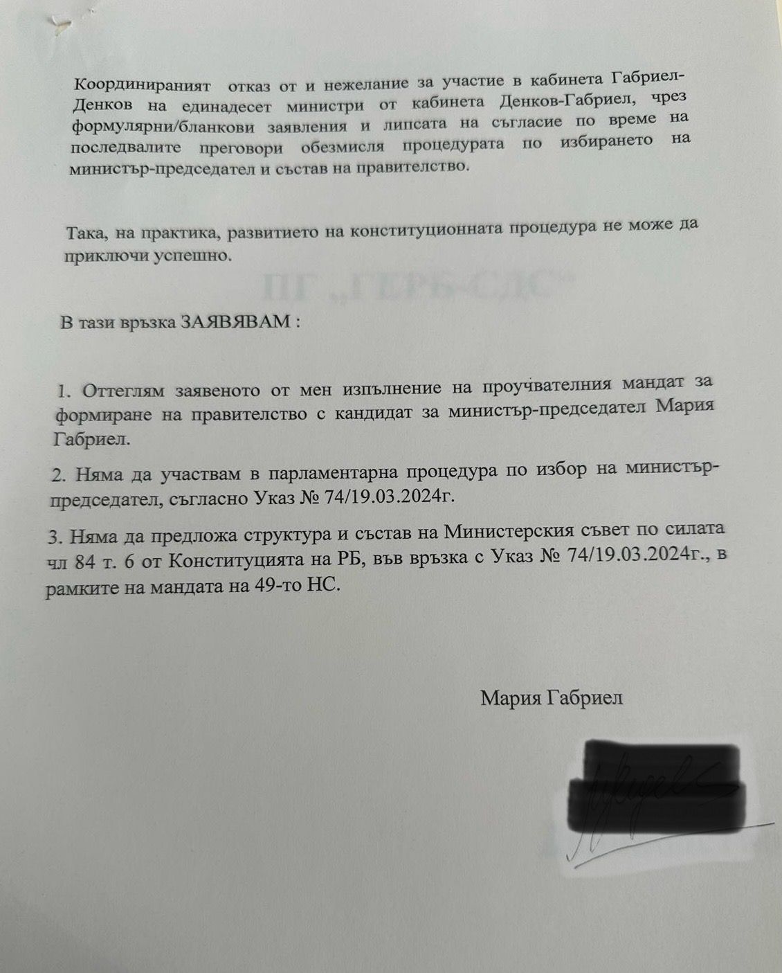 Мария Габриел подчертава още, че „координираният отказ от и нежелание за участие в кабинета Габриел-Денков на 11 министри от кабинета Денков-Габриел, чрез формулярни/бланкови заявления и липсата на съгласие по време на последвалите преговори, обезсмисля процедурата по избирането на министър-председател и състав на правителство. Така, на практика, развитието на конституционната процедура не може да приключи успешно“.