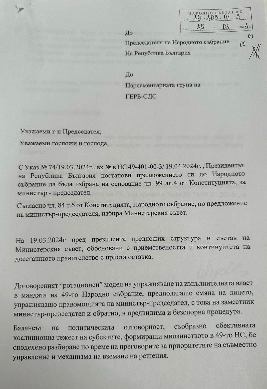 Документът беше внесен в деловодството на Народното събрание тази сутрин в 9:09 часа, съобщават от ГЕРБ.