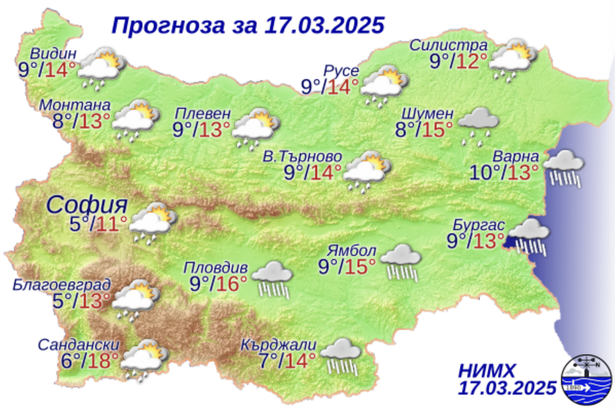 По Черноморието ще бъде облачно и дъждовно. По-значителен валеж се очаква по Южното Черноморие. Вятърът ще бъде слаб до умерен от изток-североизток, а в края на деня – силен от север-североизток. Максималните температури ще бъдат между 10° и 14°. Температурата на морската вода е 8°-9°. Вълнението на морето ще бъде 1-2 бала, с тенденция в края на деня да се усилва до 3-4 бала.