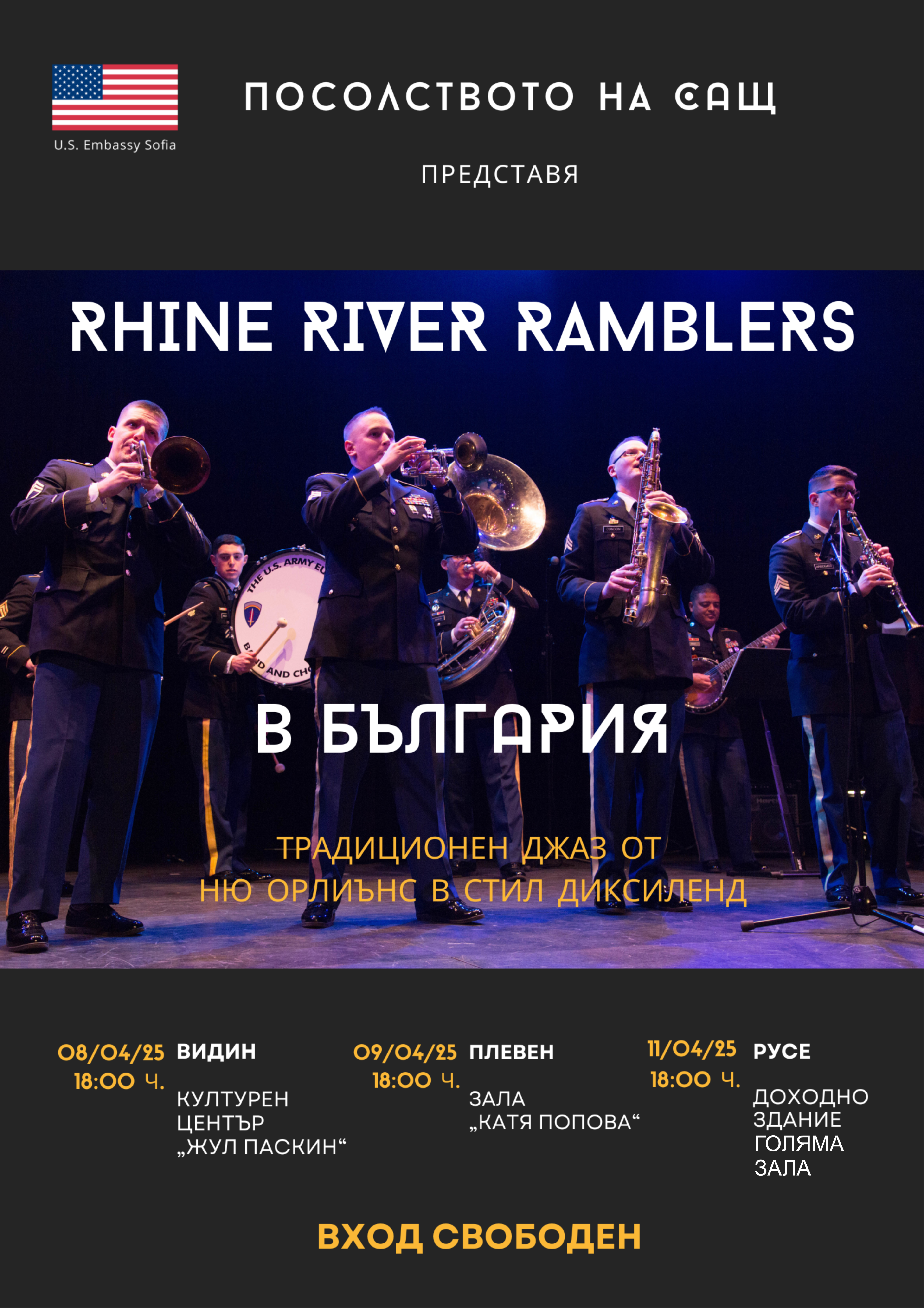 Диксиленд групата към Оркестъра на Въоръжените сили на САЩ в Европа „Rhine River Ramblers“ ще пренесе публиката в началото на 20-и век със своите вълнуващи мелодии. Концертът ще се проведе на 11 април от 18 ч., като Русе е един от трите български града, където групата ще има безплатно участие. Покани могат да се вземат предварително на касата на Доходното здание.