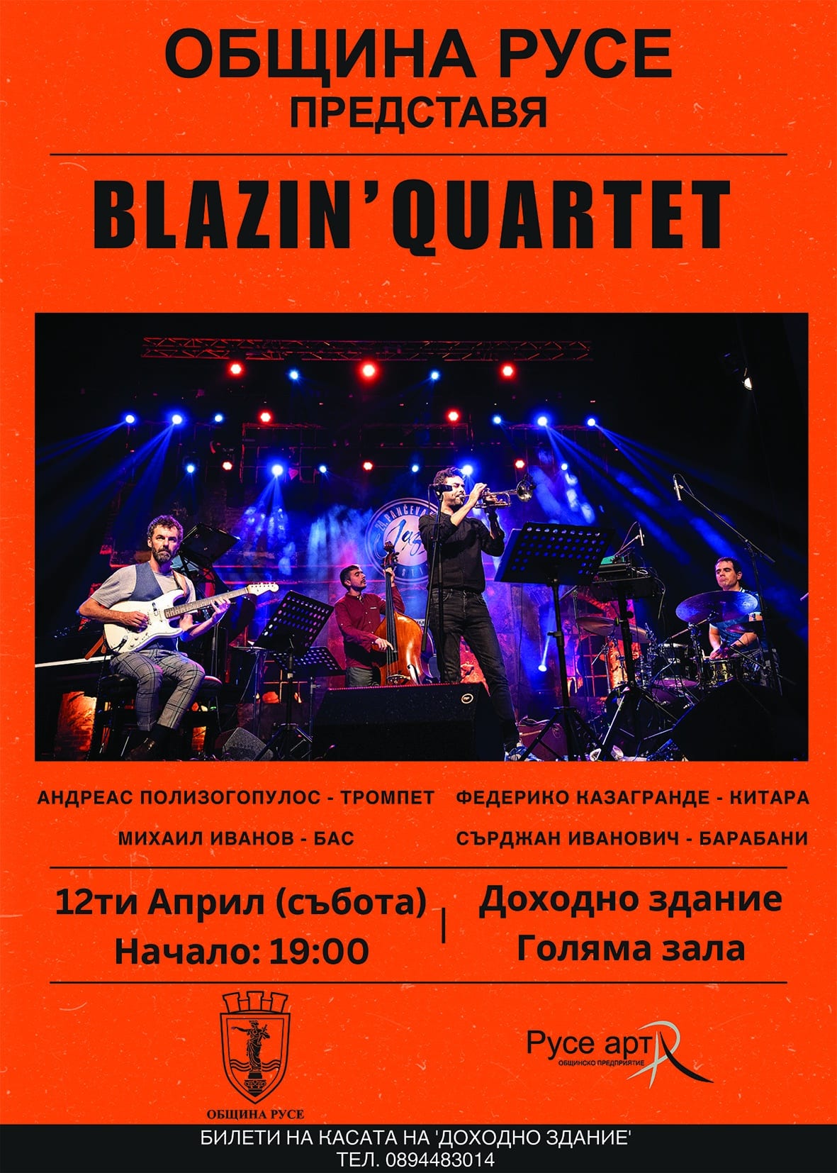На 12 април от 19 ч. русенци и гостите на града могат да чуят европейската група „Blazin’ Quartet“. В иновативния проект на барабаниста и композитор Сърджан Иванович се включват гръцкият тромпетист Андреас Полизогопулос – един от най-популярните музиканти в страната си, италианският китарист и звезда на европейската джаз сцена Федерико Казагранде и Михаил Иванов – един от най-иновативните басисти на Балканите. Музикантите ще представят експериментални ритми и виртуозни изпълнения на модерен джаз с балкански и средиземноморски влияния. Билети могат да бъдат закупени на касата на Доходното здание.