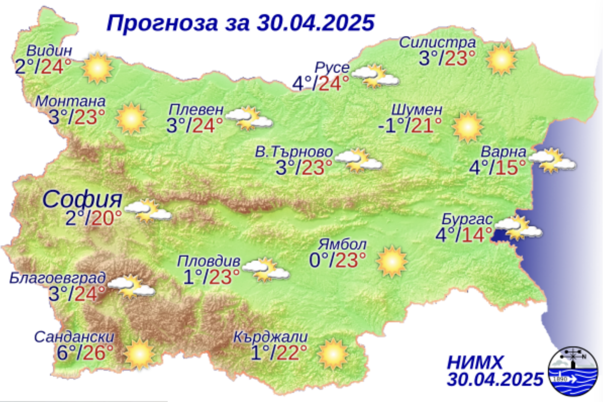 По Черноморието ще бъде предимно слънчево. Ще духа слаб до умерен вятър от изток-североизток. Максималните температури ще бъдат между 13° и 15°. Температурата на морската вода е 12°-13°. Вълнението на морето ще бъде 3-4 бала.