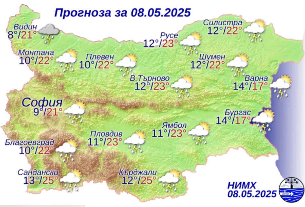 Днес атмосферата над страната отново ще бъде неустойчива. Още преди обяд ще започне да се развива купеста и купесто-дъждовна облачност. В следобедните часове в голяма част от страната ще има краткотрайни валежи от дъжд и гръмотевична дейност. Ще има условия за градушки. Ще духа слаб до умерен вятър от изток-югоизток. Максималните температури ще бъдат между 20° и 25°, за София – около 21°.