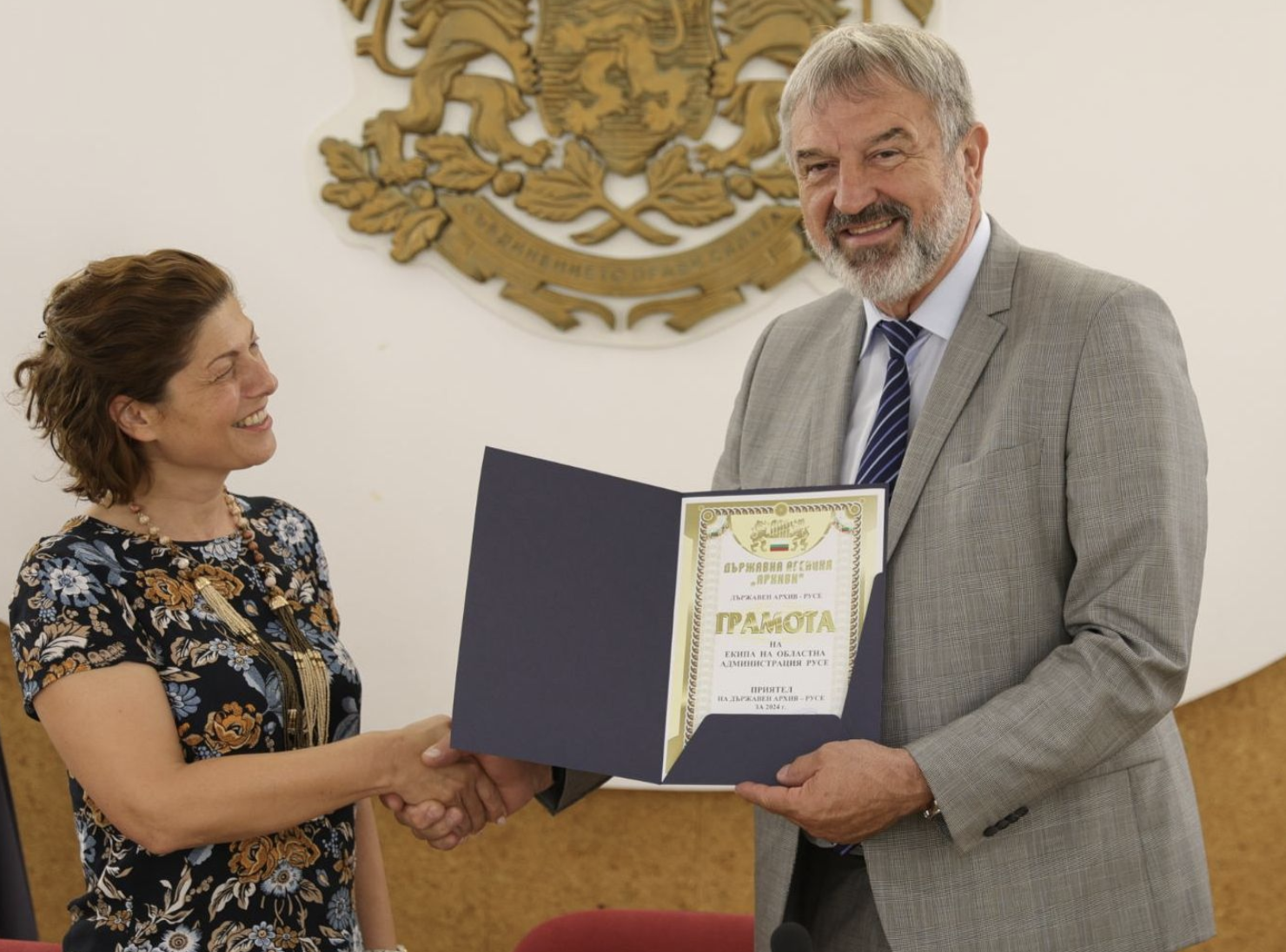 Областната администрация в Русе бе отличена с грамота на Държавен архив – Русе. Поводът е Международният ден на архивите и добрата съвместна работа между двете институции през изминалата 2024 година.
