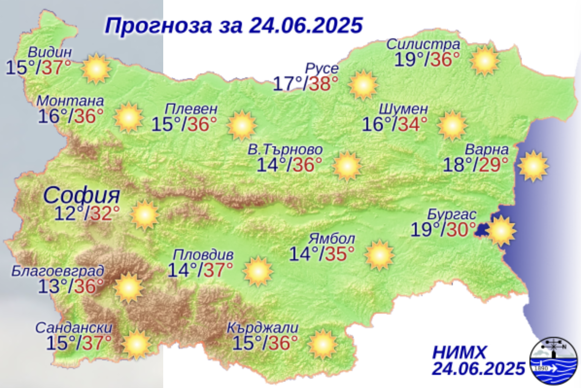 Сутринта над страната ще е ясно и почти тихо. През деня ще бъде слънчево. Ще духа слаб вятър от запад-северозапад. След обяд в много равнинни райони ще е горещо. Максималните температури ще бъдат между 32° и 37°, за София – около 32°.