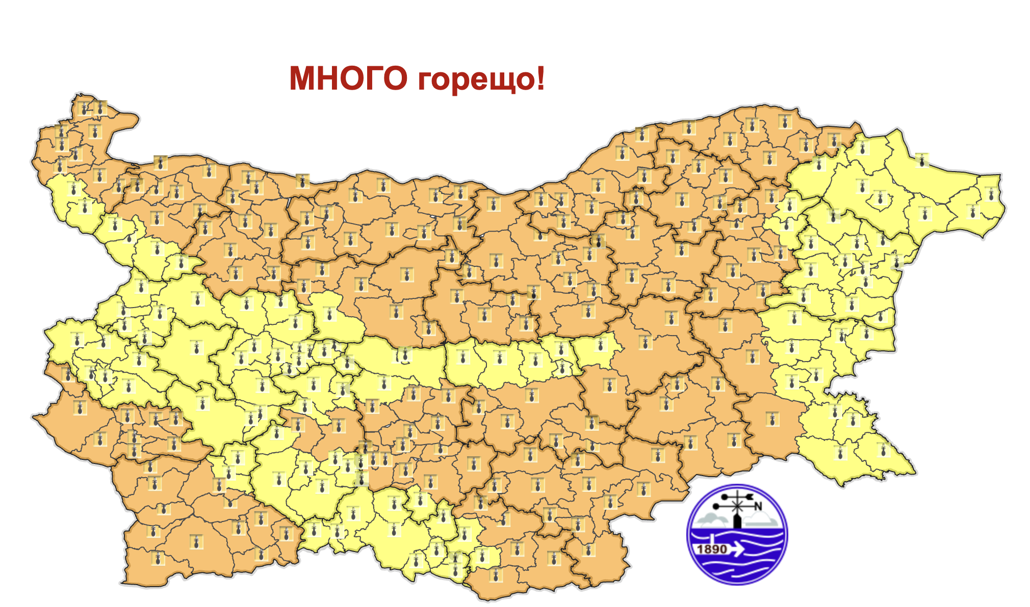 Сутринта ще е ясно. Ще духа слаб, в Източна България до умерен югоизточен вятър. През деня ще бъде слънчево и горещо с максимални температури в повечето места между 36° и 41°, за София: 36°-37°. След обяд ще има купеста облачност, по-значителна привечер над северозападните райони, където ще превали и прегърми. Вятърът от юг ще се усили, но вечерта в северозападните райони ще започне да се ориентира от запад-северозапад. Ще нахлува хладен въздух.