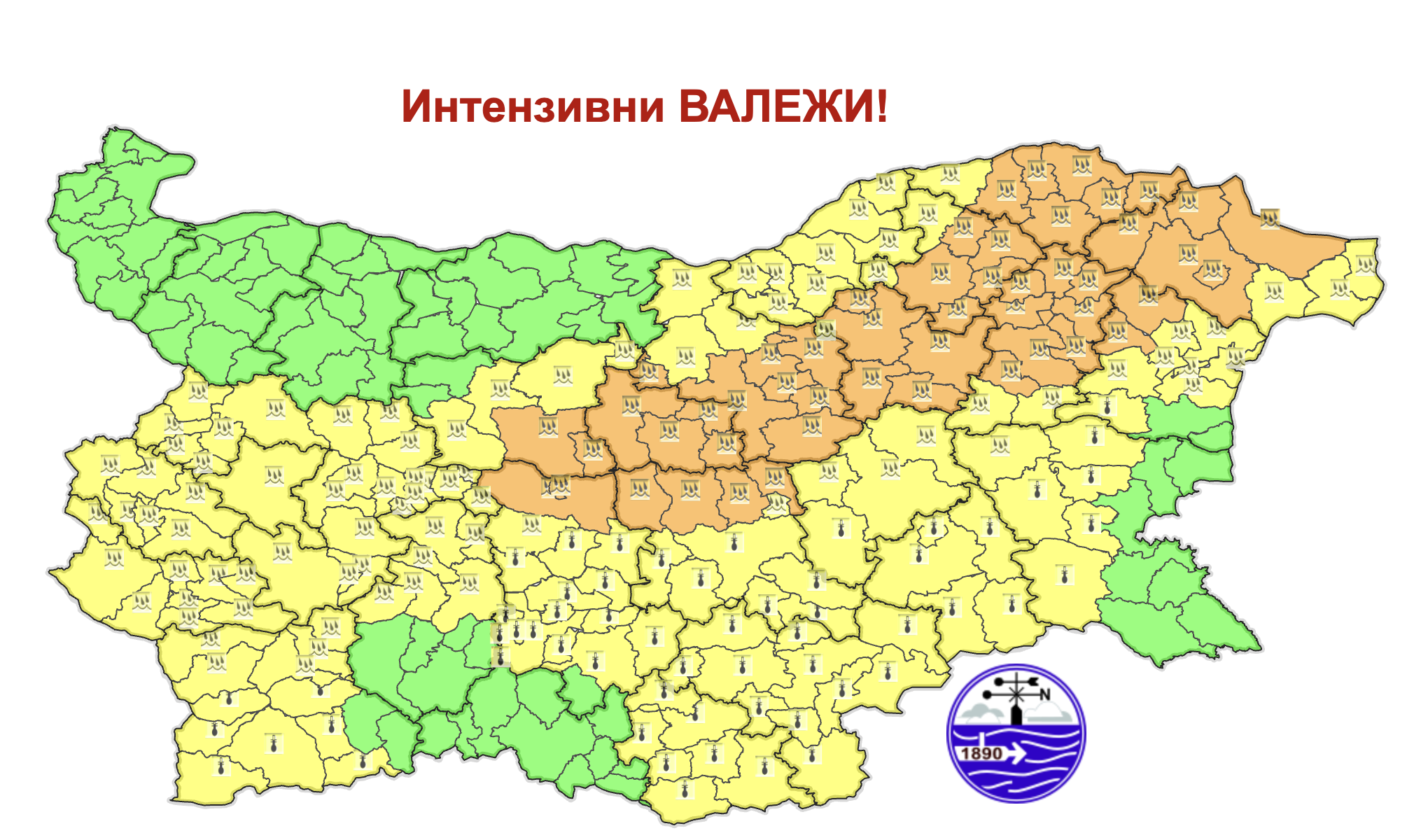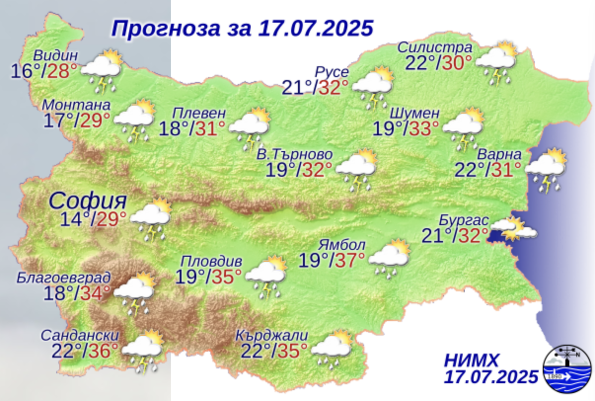 Днес през страната ще премине студен атмосферен фронт и на много места ще има краткотрайни валежи с гръмотевични бури и градушки. По-интензивни ще са явленията вечерта и през нощта срещу петък. Вятърът ще се ориентира от северозапад, ще се усили и с него ще започне да нахлува хладен въздух. Към 15 часа температурите ще бъдат от 24°-25° в крайните северозападни райони до 37°-38° в Югоизточна България, където ще остане почти без валежи.