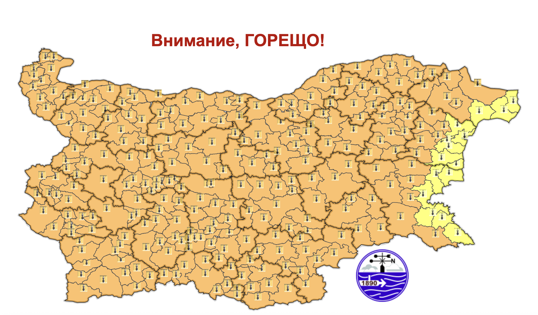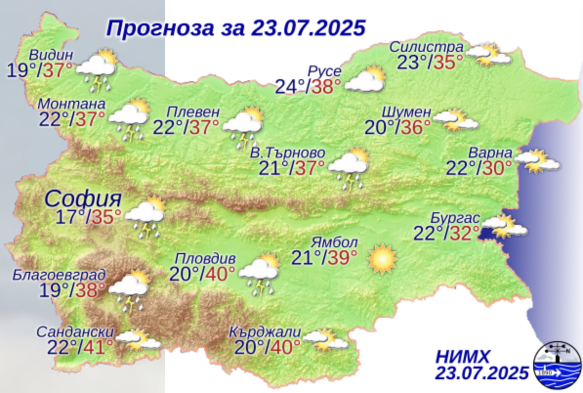 През нощта над по-голямата част от страната ще е предимно ясно и почти тихо. На отделни места в североизточните райони все още ще превалява слабо. Преди обяд ще бъде слънчево. В следобедните часове атмосферата ще се лабилизира. Ще се развива купеста и купесто-дъждовна облачност и на места, главно в западните и централните райони, ще превали краткотраен дъжд с гръмотевици. В Северна България временно ще проникне относително хладен въздух. Вятърът ще се ориентира от изток-североизток и ще бъде слаб и умерен. Отново ще е горещо с максимални температури между 35° и 40°, за София – около 35°.