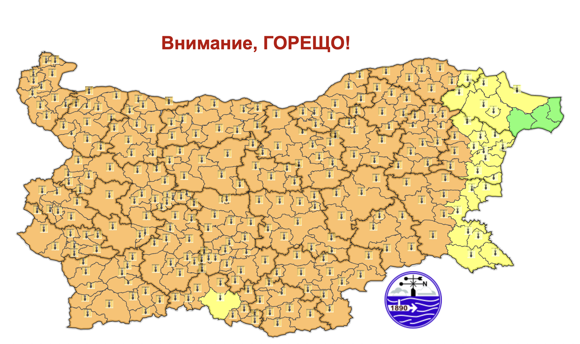 Днес преди обяд по-значителна облачност ще има над източните райони, като все още дъжд ще превалява в Североизточна България. В останалата част от страната ще бъде слънчево. До обяд и над източните части от страната облачността ще намалее и там ще се установи предимно слънчево време. След обяд над планинските райони ще се развива купеста облачност и на места, главно в масивите от западната половина от страната, ще има краткотрайни валежи от дъжд, придружени с гръмотевици. Ще духа слаб до умерен източен вятър. Максималните температури ще бъдат между 35° и 40°, за София – около 36°.