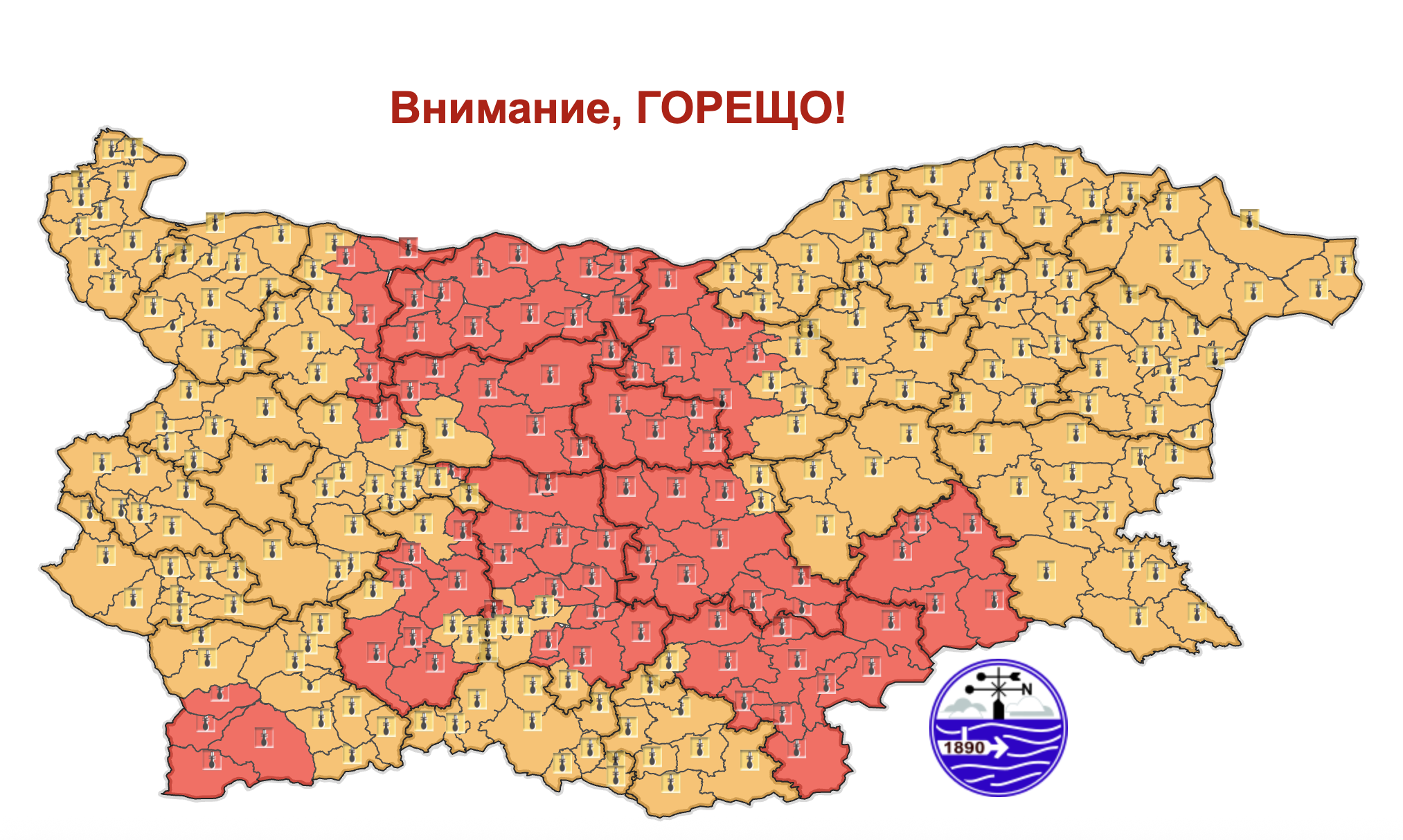 През нощта ще бъде ясно, топло, почти тихо и задушно. През деня ще бъде слънчево, след обяд – отново много горещо. След пладне над западната половина от страната ще се развива купеста и купесто-дъждовна облачност и на места ще има краткотрайни валежи и гръмотевици. Има условия за градушки. Ще духа до умерен югоизточен вятър, който след обяд в Западна България ще се ориентира от запад-северозапад и с него ще започне да прониква хладен въздух. Максималните температури ще са между 37° и 42°, в София – около 37°.
