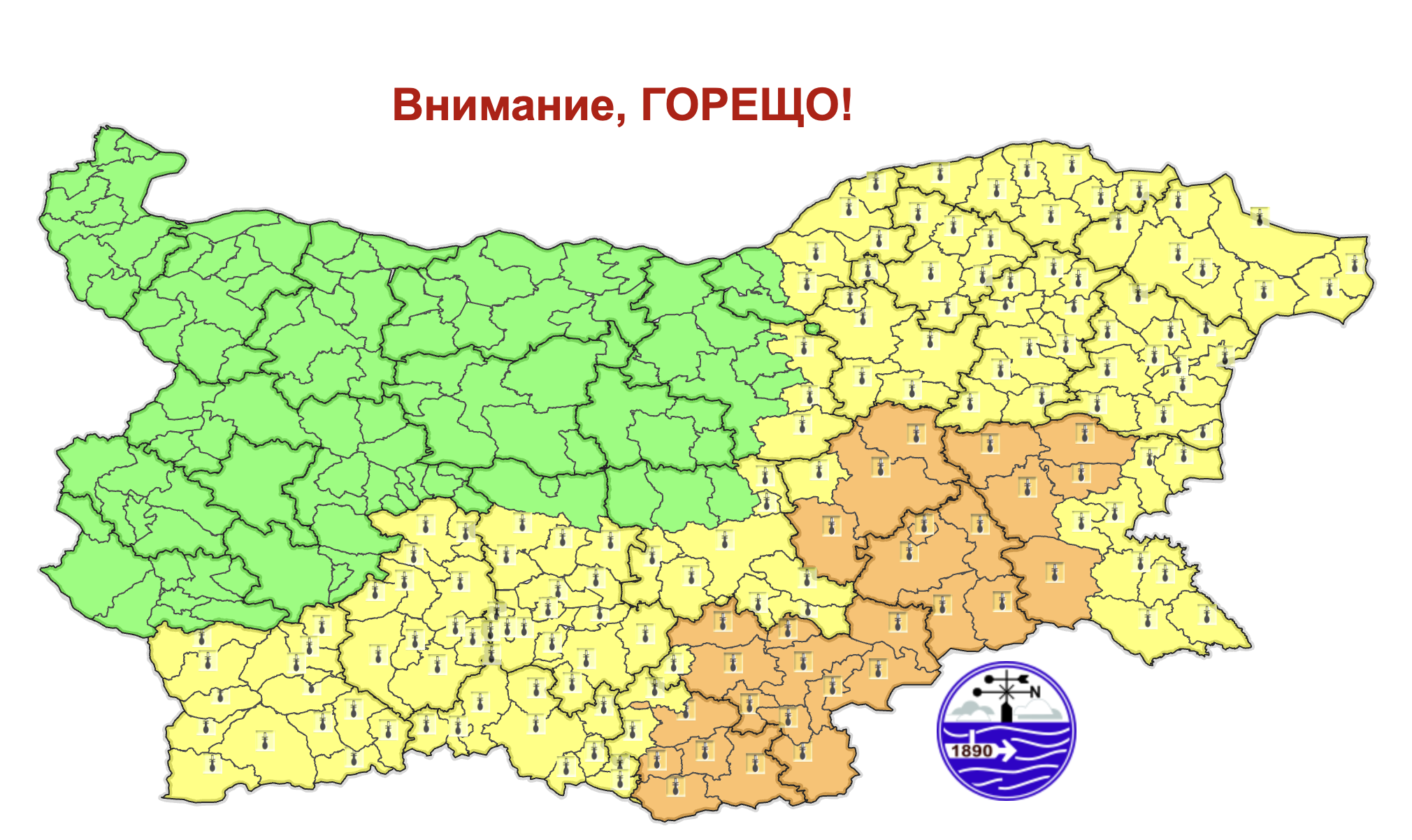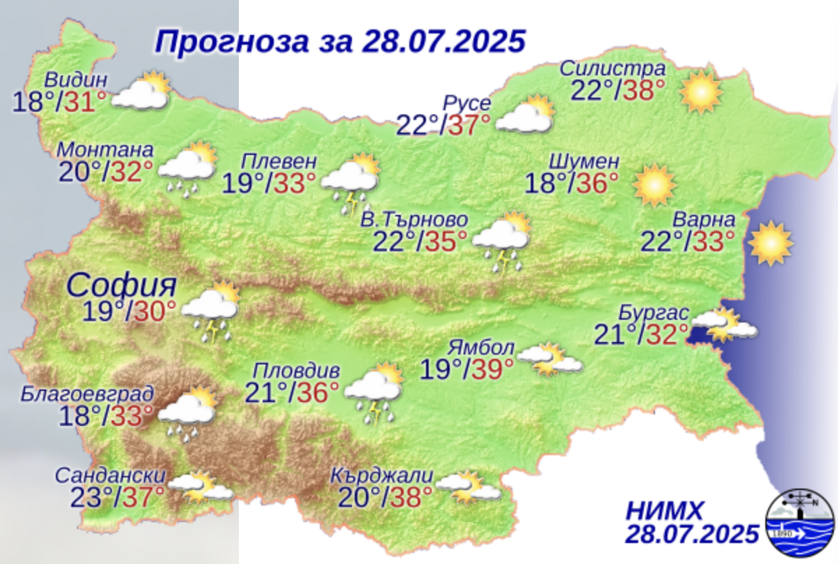 Днес ще е слънчево. Около и след обяд над Западна и Централна България ще се развива купеста и купесто-дъждовна облачност и на места ще има краткотрайни валежи от дъжд и гръмотевични бури. Ще има условия за градушки. Ще духа слаб до умерен северозападен вятър, в Югоизточна България от север-североизток. Максималните температури ще са от 30° в северозападните до 39° в югоизточните райони, в София – около 30°.