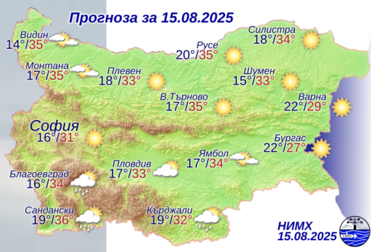 Днес в повечето райони ще е предимно слънчево. В Югозападна България и планините ще се развива купеста облачност и на места ще превали. Ще духа до умерен, в Югоизточна България временно силен вятър от изток-североизток. Максималните температури ще бъдат между 31° и 36°, за София – около 31°.