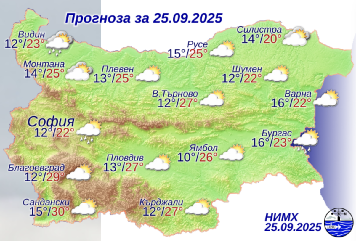 През деня над страната облачността ще е разкъсана, но значителна. Слаби превалявания от дъжд ще има на отделни места в западните райони, а след обяд в планините от Югозападна България ще превали и прегърми. Слаб дъжд ще превали и на отделни места по Черноморието и в югоизточните райони. Вятърът ще се задържи предимно умерен от изток-североизток, като в Дунавската равнина и източните райони ще се усили. От североизток ще започне да нахлува студен въздух. Максималните температури ще бъдат от 20°-22° в североизточните райони до 28°-30° в югозападните, за София – около 22°.