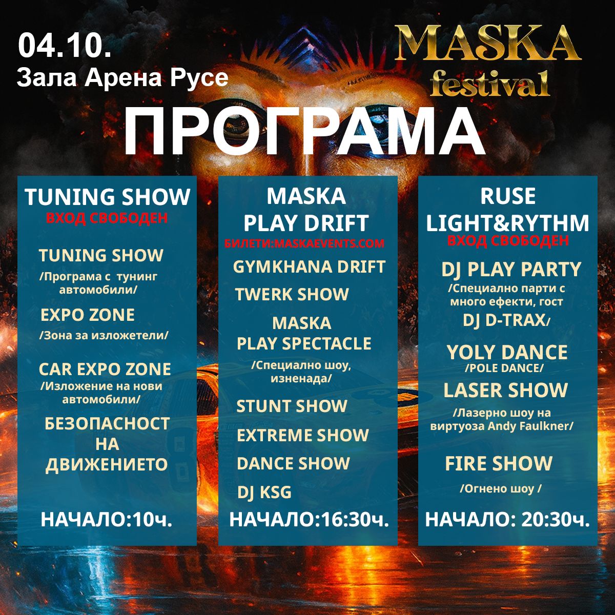 Международният фестивал „MASKA“ ще се проведе на 4 октомври 2025 г. на паркинга на зала „Арена Русе“. Събитието се очаква да  превърне Русе в епицентър на тунинг и дрифт културата, като събере на едно място някои от най-впечатляващите модифицирани автомобили,  както и професионалисти от България и Румъния. Проявата обещава уникално преживяване, съчетаващо визуални ефекти и шоу на световно ниво. Организаторите от „Маска България“ обясняват, че фестивалът ще отвори нова страница в своята история с амбициозна визия и иновативен подход, като тази година дава възможност на всеки посетител да бъде активен участник в неповторимото преживяване.