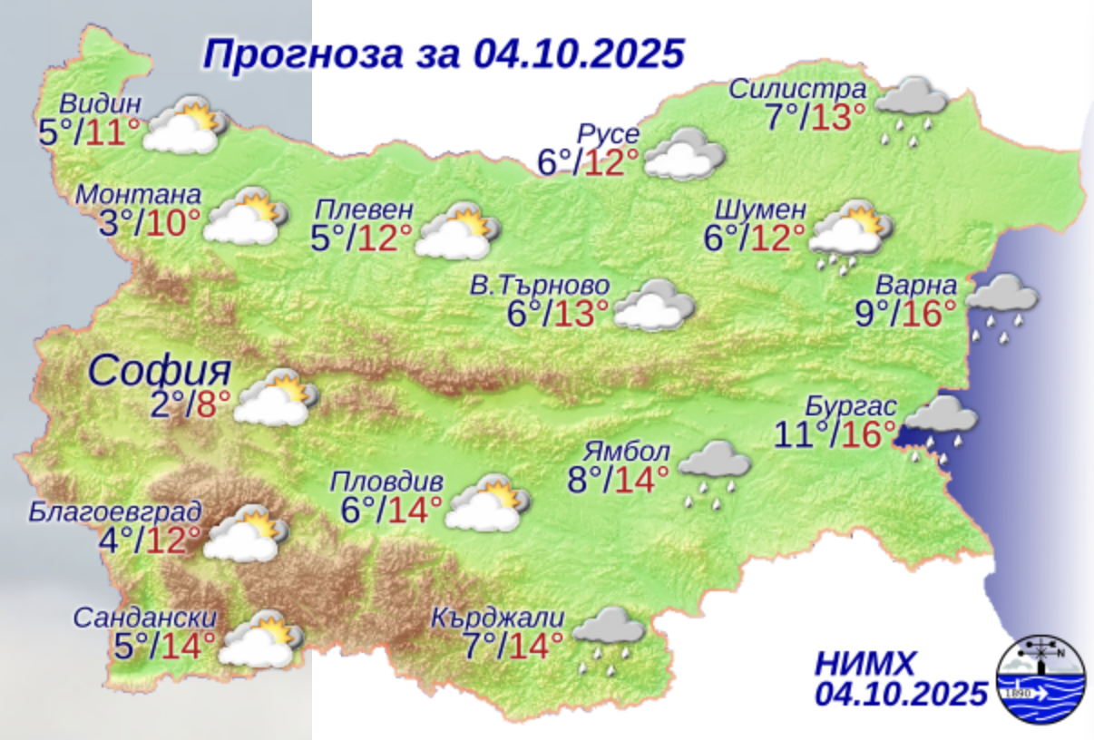Сутринта ще е облачно. В южните райони от страната ще вали дъжд. Ще духа слаб и умерен западен вятър. Минималните температури ще бъдат между 2° и 7°, за София – около 2°. През деня облачността над повечето райони ще се задържи значителна. Валежи от дъжд ще има на много места в източната половина от страната, като през втората половина на деня те ще отслабнат и ще започнат да спират. Вятърът ще остане от запад до умерен. Максималните температури ще бъдат между 8° и 13°, по-високи в югоизточните райони и по Черноморието, за София – около 8°.