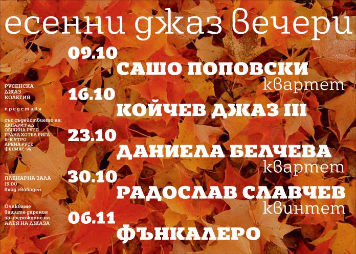 Утвърдените имена в джаза – „Сашо Поповски Трио“, „Койчев джаз трио“, „Даниела Белчева квартет“, „Радослав Славчев квинтет“ и „Фънкалеро“ ще изгреят тази есен на сцената в Русе. „Есенни джаз вечери“ е концертен цикъл, който ще радва русенската публика всеки четвъртък от 9 октомври до 6 ноември в Пленарна зала на Община Русе от 19 часа при вход свободен. Събитията се организират от Сдружение „Русенска джаз колегия“ и подкрепен от Община Русе, „Дунарит“, Гранд хотел „Рига“, вестник „Утро“, „Арена Русе“ и „Феникс 94″. „Есенните джаз вечери“