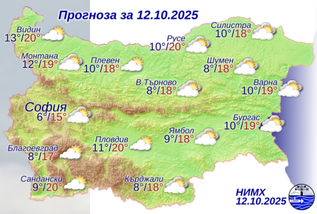 Днес ще продължи да духа най-често умерен вятър от запад-северозапад, в Дунавската равнина, североизточните райони и района на Сливен и временно силен. Облачността ще бъде променлива, по-често значителна. Максималните температури ще бъдат между 15° и 20°, за София – около 15°.