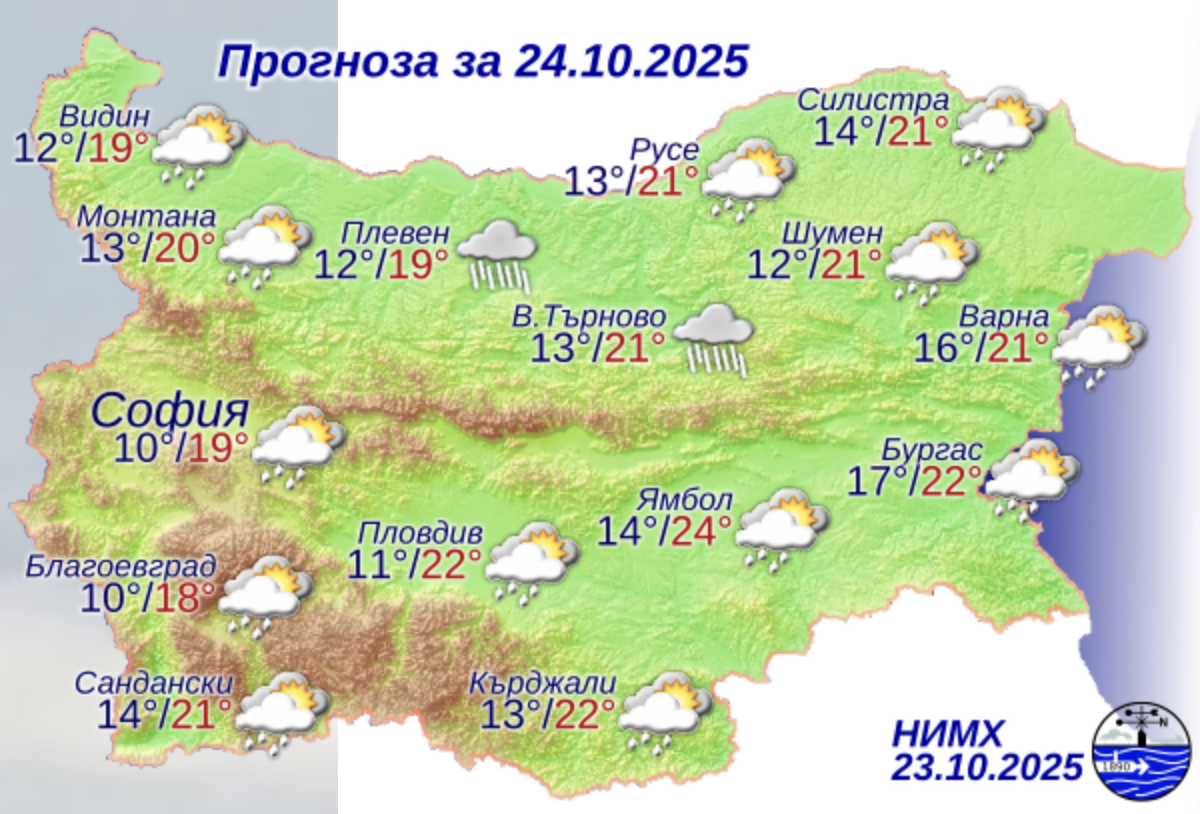 През нощта облачността от запад ще се увеличава и до сутринта в западните райони ще завали дъжд. Ще духа умерен, на север от планините силен вятър от юг-югозапад. Минималните температури ще бъдат между 10° и 15°, в София – около 10°. През деня ще бъде предимно облачно. От запад на изток на много места ще има валежи от дъжд. След обяд от северозапад валежите ще спират, а облачността ще се разкъсва. Вятърът ще се ориентира от запад-северозапад, ще е умерен, в Дунавската равнина и Горнотракийската низина – силен. Максималните температури ще бъдат между 19° и 24°, в София – около 19°.
