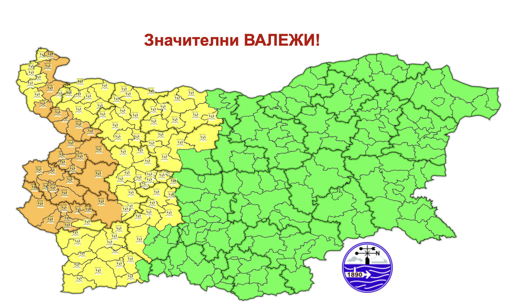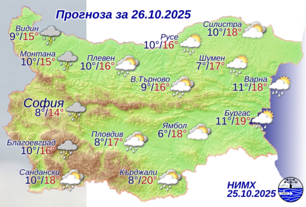 През нощта облачността от запад ще продължи да се увеличава и вплътнява и в Западна България ще завали дъжд. Ще духа слаб до умерен вятър от юг-югозапад. Минималните температури ще бъдат между 5° и 10°, в София – около 8°. През деня в цялата страна ще е облачно. В западните и централните райони ще има валежи от дъжд, на места в Западна България интензивни и значителни по количество. До вечерта валежите ще обхванат и източната част от страната. Ще продължи да духа до умерен вятър от юг-югозапад, на места на север от планините и временно силен. Максималните температури ще бъдат между 14° и 19°, в София – около 14°.