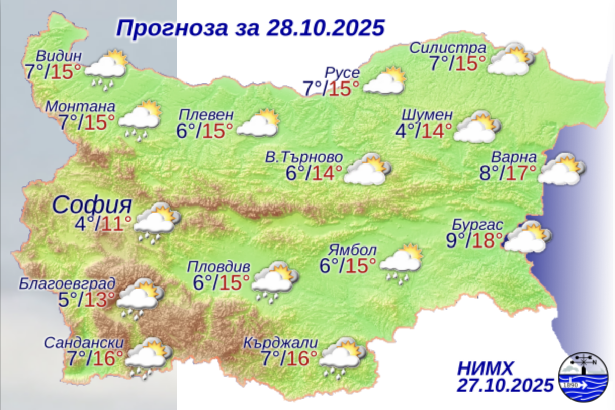 През нощта започналото от северозапад увеличение на облачността ще обхване по-голямата част от страната и на места в Северозападна България ще превали дъжд. На места в Горнотракийската низана ще е мъгливо. Вятърът за кратко ще се ориентира от запад-югозапад, ще е слаб. Минималните температури ще бъдат между 3° и 8°, в София – около 4°. Преди обяд облачността ще е значителна и на места от северозапад на югоизток ще превали дъжд. На повече места и повече по количество ще са валежите в Югозападна България, а почти без валежи ще се задържи в североизточните райони. След обяд от северозапад облачността ще се разкъсва и ще намалява. Ще духа умерен, в Дунавската равнина и Горнотракийската низина – силен вятър от запад-северозапад. Максималните температури ще бъдат между 11° и 16°, в София – около 11°.