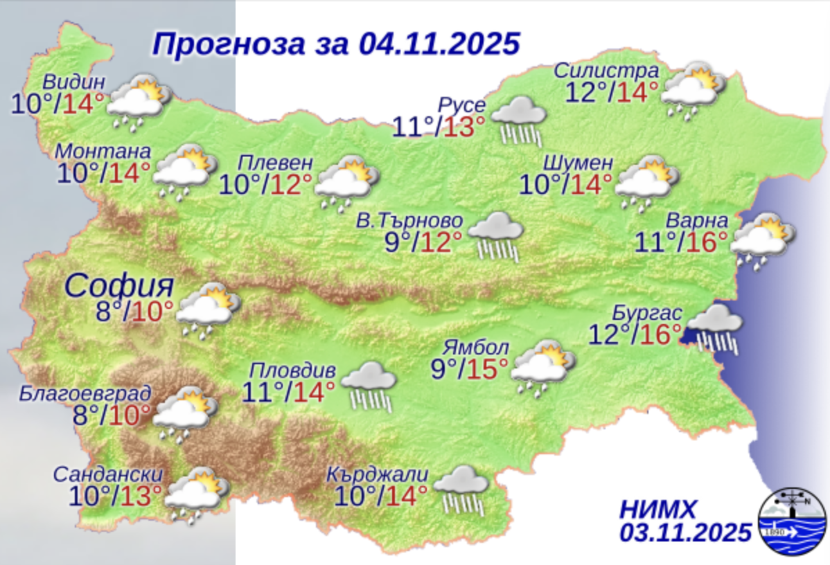 Днес ще се задържи облачно на много места с валежи от дъжд, които от запад на изток ще спират. Ще духа умерен, в Дунавската равнина и Горнотракийската низина временно силен северозападен вятър. Максималните температури ще бъдат между 10° и 15°, в София – около 10°.