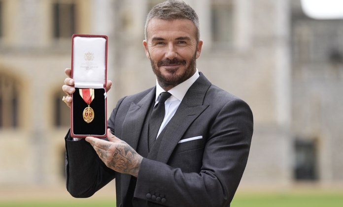 Облечен в костюм, ушит специално за повода от неговата съпруга – модната дизайнерка Виктория Бекъм – бившият футболист беше посрещнат от крал Чарлз III в Уиндзор, където получи рицарското си звание за заслуги към спорта и благотворителността.