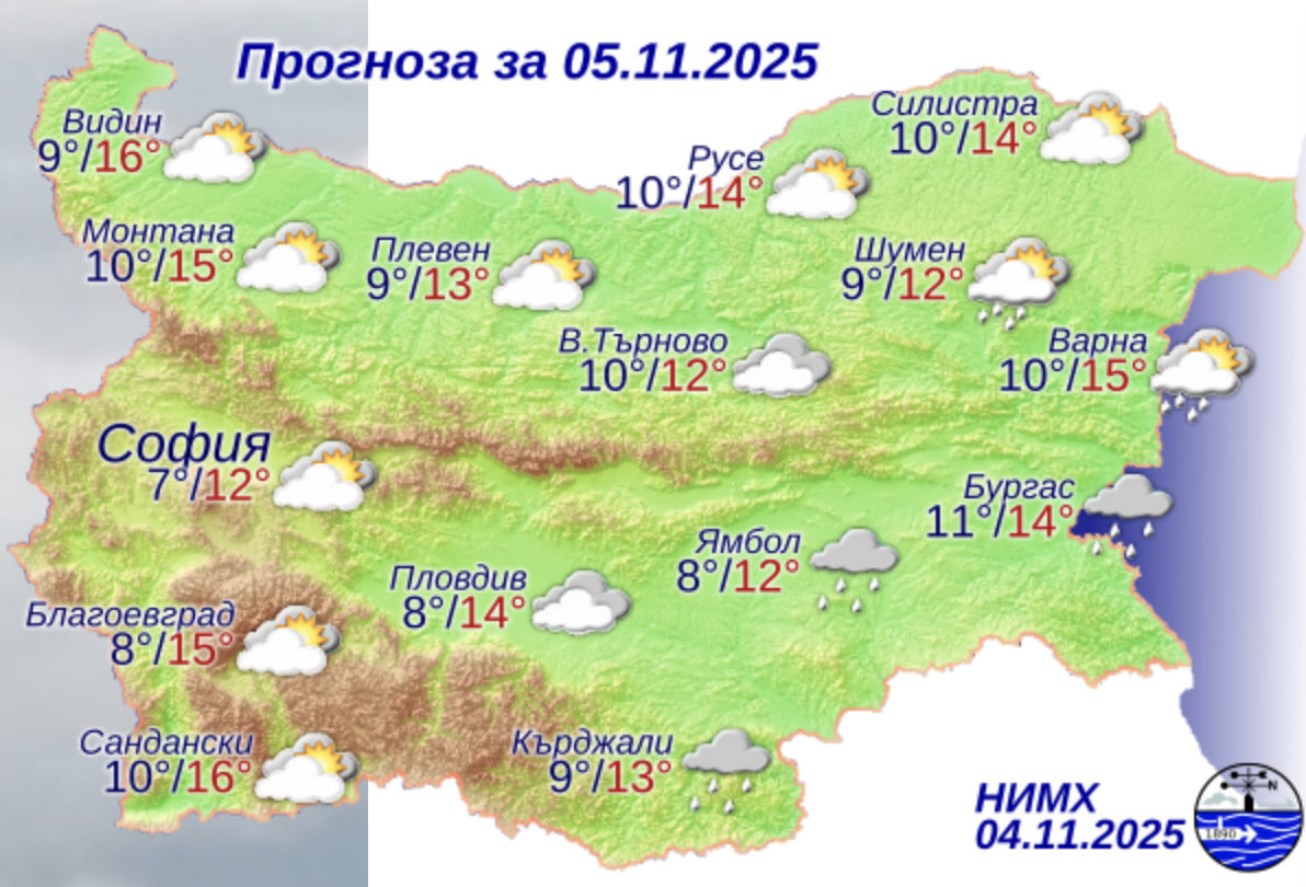 През нощта ще се задържи облачно, на места в югоизточната половина от страната все още с валежи от дъжд. Ще духа слаб, в Източна България до умерен вятър от север-североизток. Минималните температури ще бъдат между 5° и 10°, в София – около 7°. През деня облачността ще е значителна, на места, главно в Югоизточна България и планинските райони, със слаби валежи от дъжд. Вятърът в Западна и Централна България ще е слаб от изток-североизток, в Източна – до умерен от север-североизток. Дневните температури ще останат почти без промяна, максималните ще са между 10° и 15°, в София – около 12°.