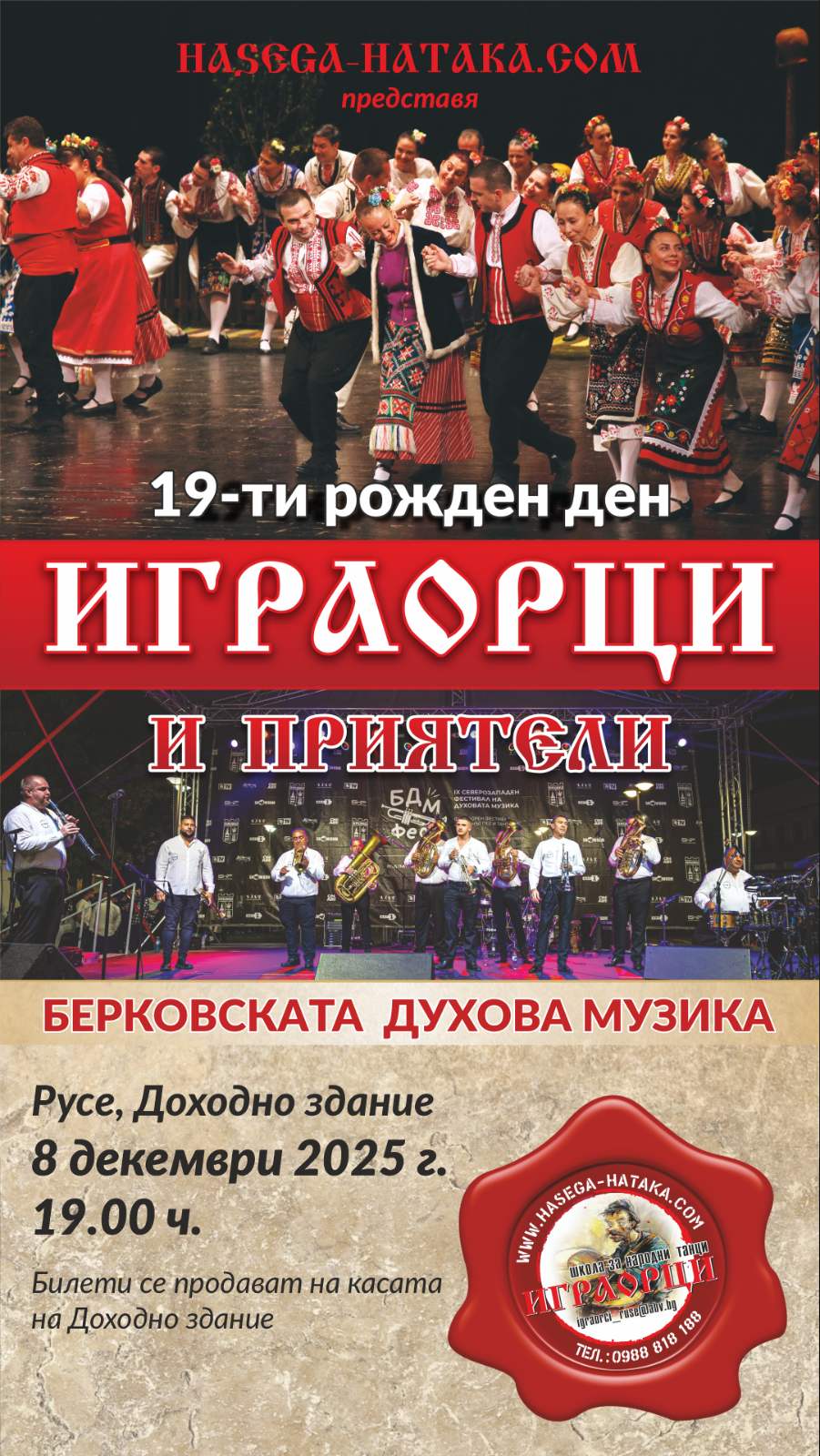 Школа за фолклорни танци „Играорци“- Русе с художествен ръководител Богдан Донев празнува своя 19-и рожден ден с благотворителен концерт под патронажа на кмета на Община Русе Пенчо Милков и в партньорство с Община Русе. Техни гости ще бъдат прочутата Берковска духова музика.