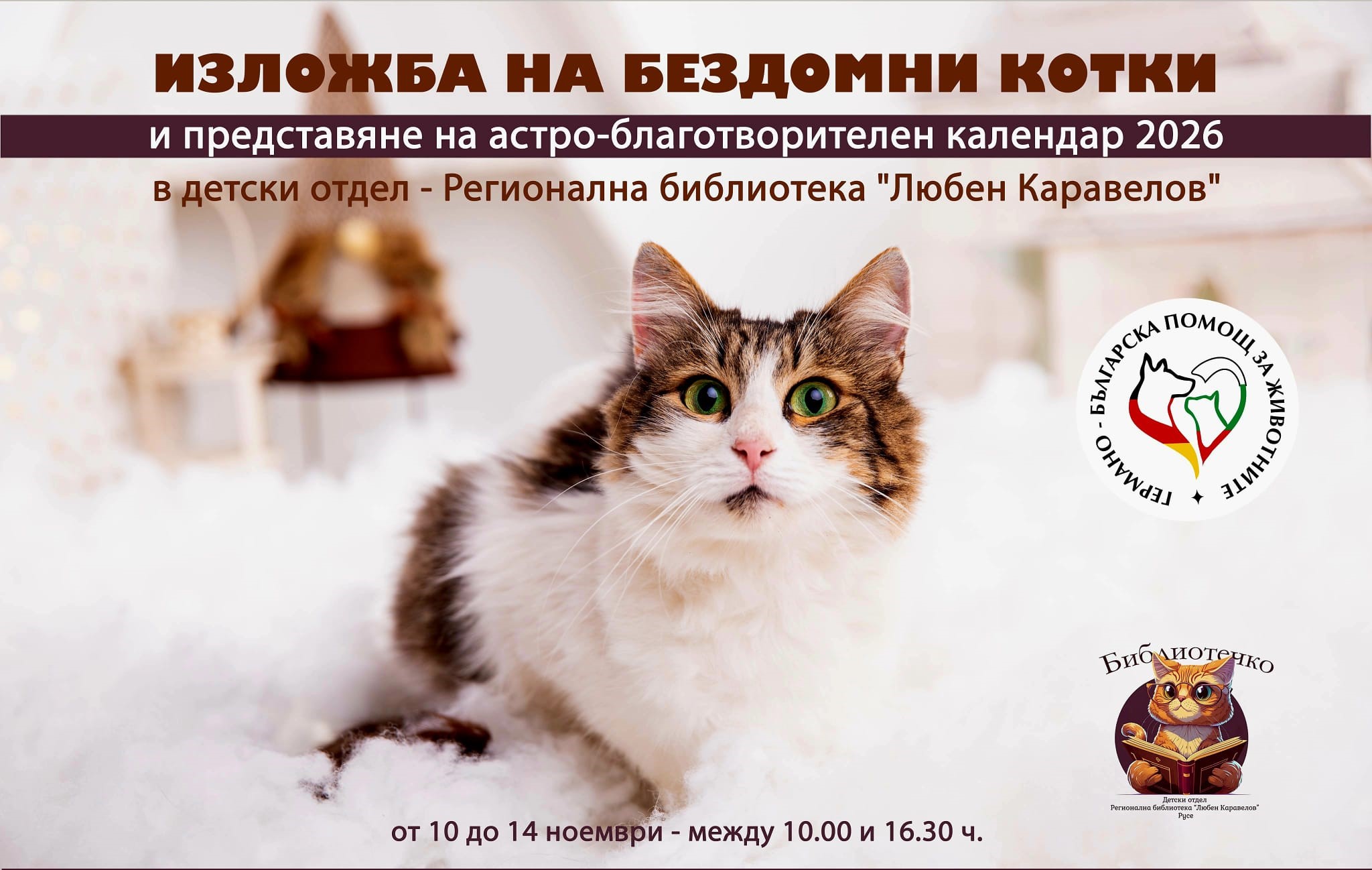 СНЦ „Германо-българска помощ за животните“ и Детски отдел „Библиотечко“ – Регионална библиотека „Любен Каравелов“ ви канят на събитие 2в1: изложба на котета спасени от сдружението и представяне на новия астро-благотворителен календар с питомците ни.