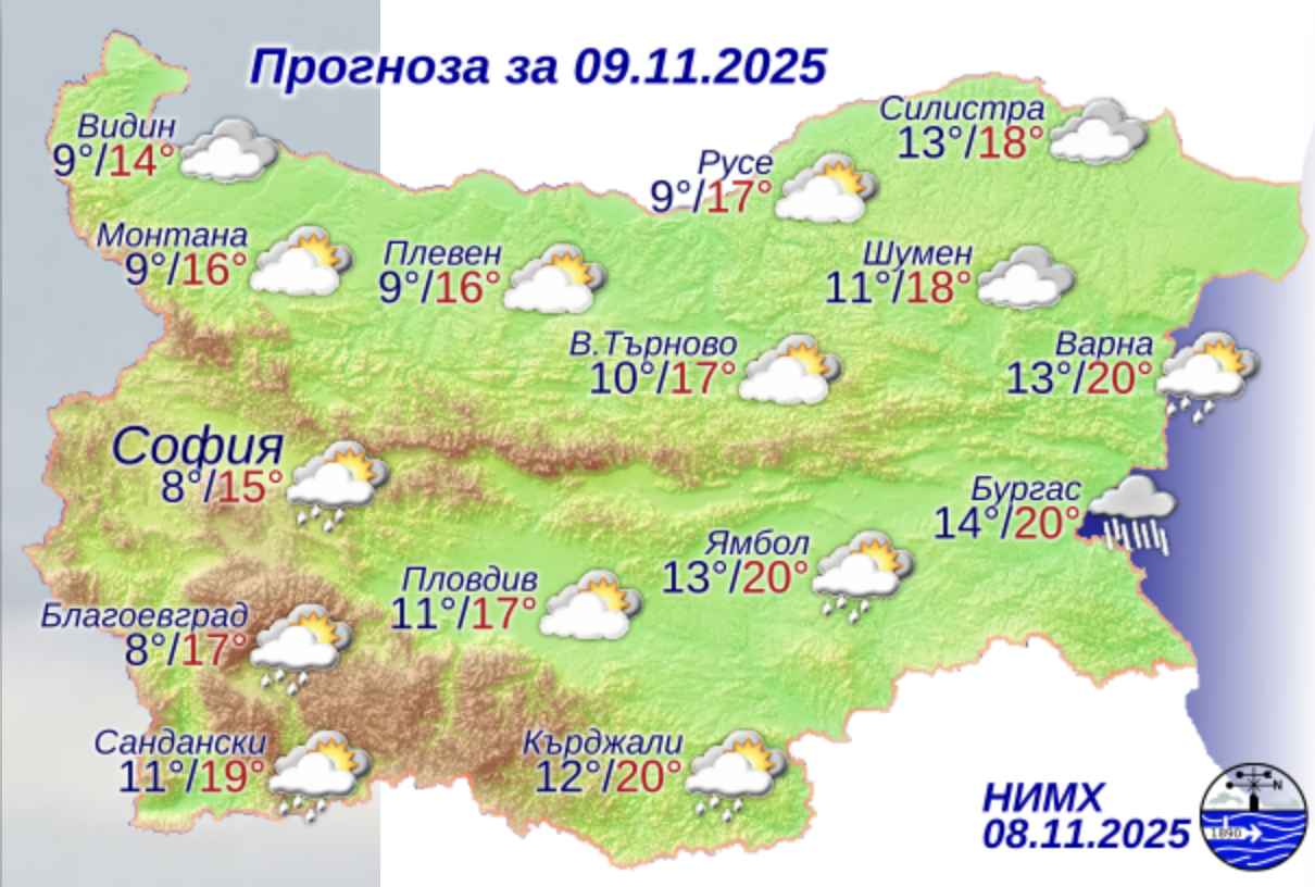 По Черноморието ще бъде облачно. След временно спиране, около обяд, отново ще има валежи от дъжд. Ще духа слаб до умерен югоизточен вятър, който постепенно ще се ориентира от юг-югозапад. Максималните температури ще са 15°-20°. Температурата на морската вода е 16°-17°. Вълнението на морето ще бъде 2-3 бала.