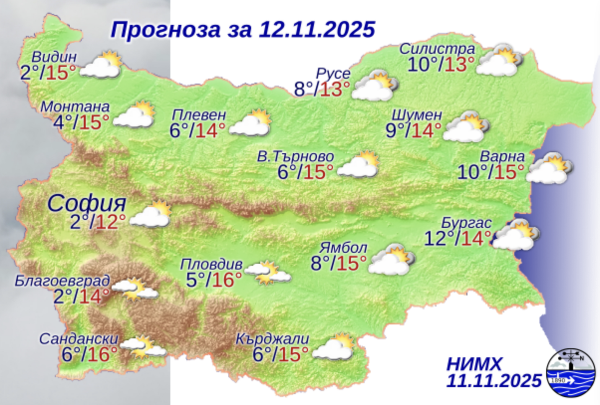 Сутринта значителна облачност ще има над Източна България. Над западната половина от страната ще бъде предимно ясно. В Дунавската равнина и източните райони ще духа слаб до умерен вятър от запад-северозапад. В котловините ще е почти тихо и ще има намалена видимост. Минималните температури ще бъдат между 4° и 9°, в котловините на Западна България – около 0°, за София – около 1°. През деня над повечето райони ще преобладава слънчево време. Ще има временни увеличения на високата и средната облачност. Над Източна България облачността ще бъде по-често значителна, временно намаляваща. Ще духа слаб, в Дунавската равнина до умерен вятър от запад-северозапад. Максималните температури ще бъдат между 12° и 17°, за София – около 12°.