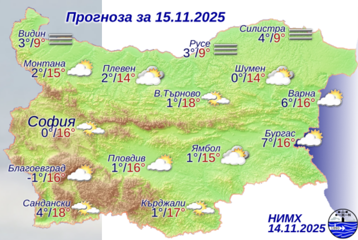 Днес не се очаква промяна в синоптичната обстановка. През втората половина на нощта над по-голямата част от страната ще преобладава ясно време, а през деня – ще е предимно слънчево. В Дунавската равнина ще е мъгливо, а през остатъкът от нощта и в часовете до обяд мъгливо ще бъде и по долините на реките в Южна България. Почти тихо. Минималните температури ще бъдат между 0° и 5°, а максималните – между 13° и 18°, значително по-ниски в местата с трайна мъгла. В София минималната температури ще е около 0°, максималната – около 16°.