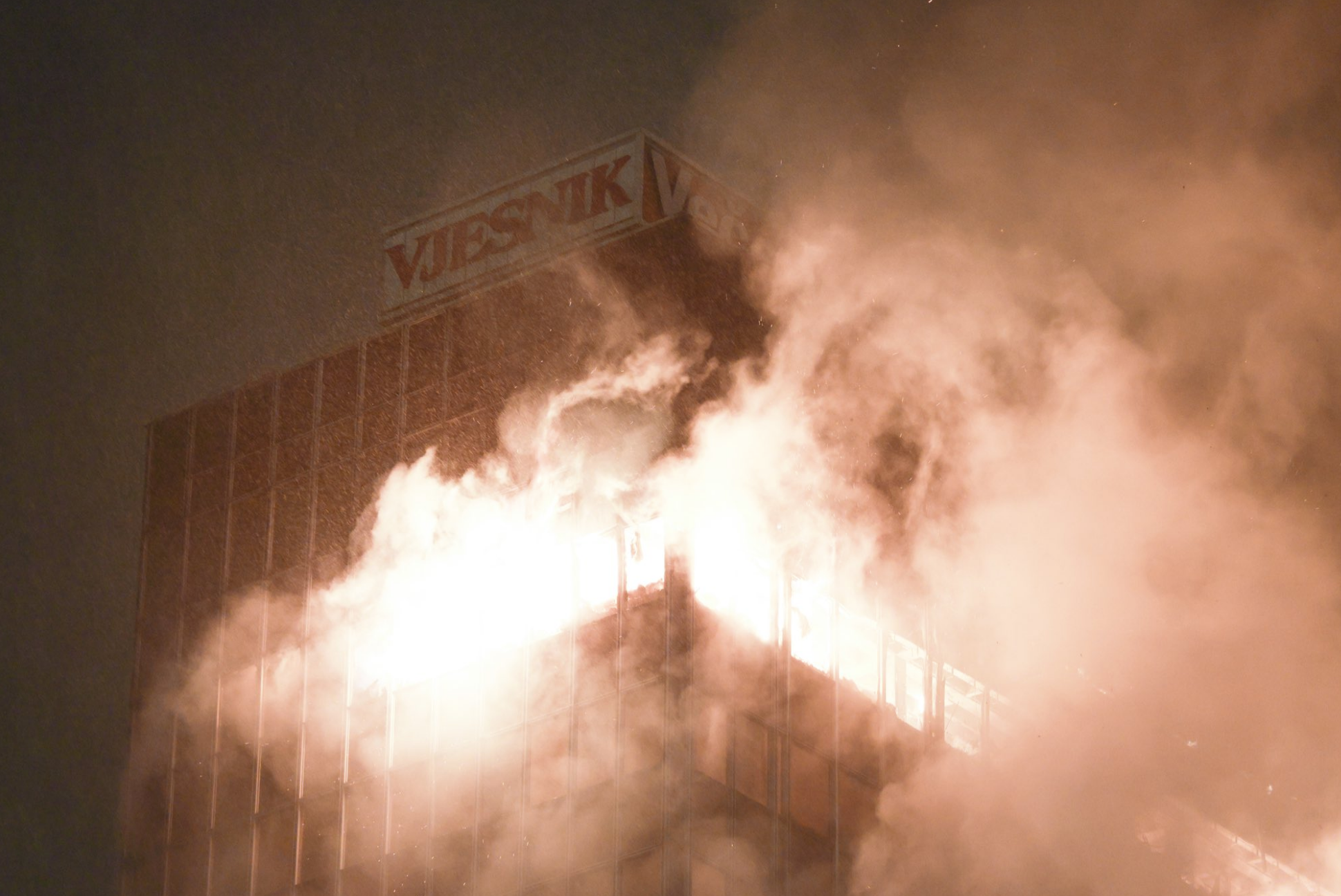 Около 100 пожарникари се борят с голям пожар в небостъргача „Вйесник“ в Загреб, който гори от снощи, съобщи Хърватското радио и телевизия. По време на избухването на пожара в сградата не е имало никой, тъй като тя е била предимно изоставена.