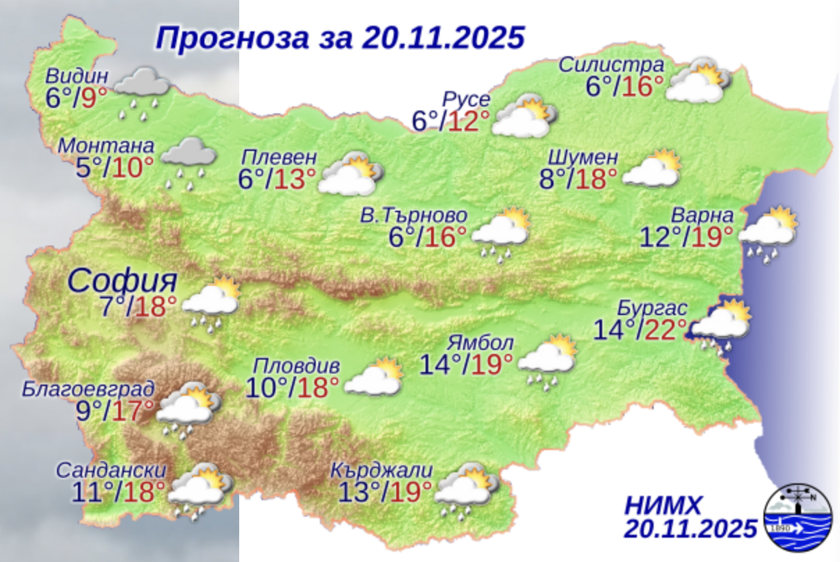 Минималните температури ще бъдат в широки граници – между 5° и 10° в по-голямата част от страната до около 13°-15° в югоизточните райони. Максималните температури ще са предимно между 10° и 15°, в Южна България и местата чувствителни на южния вятър до около 20°-22°. В София минималната температура ще бъде около 7°, а максималната – около 18°.