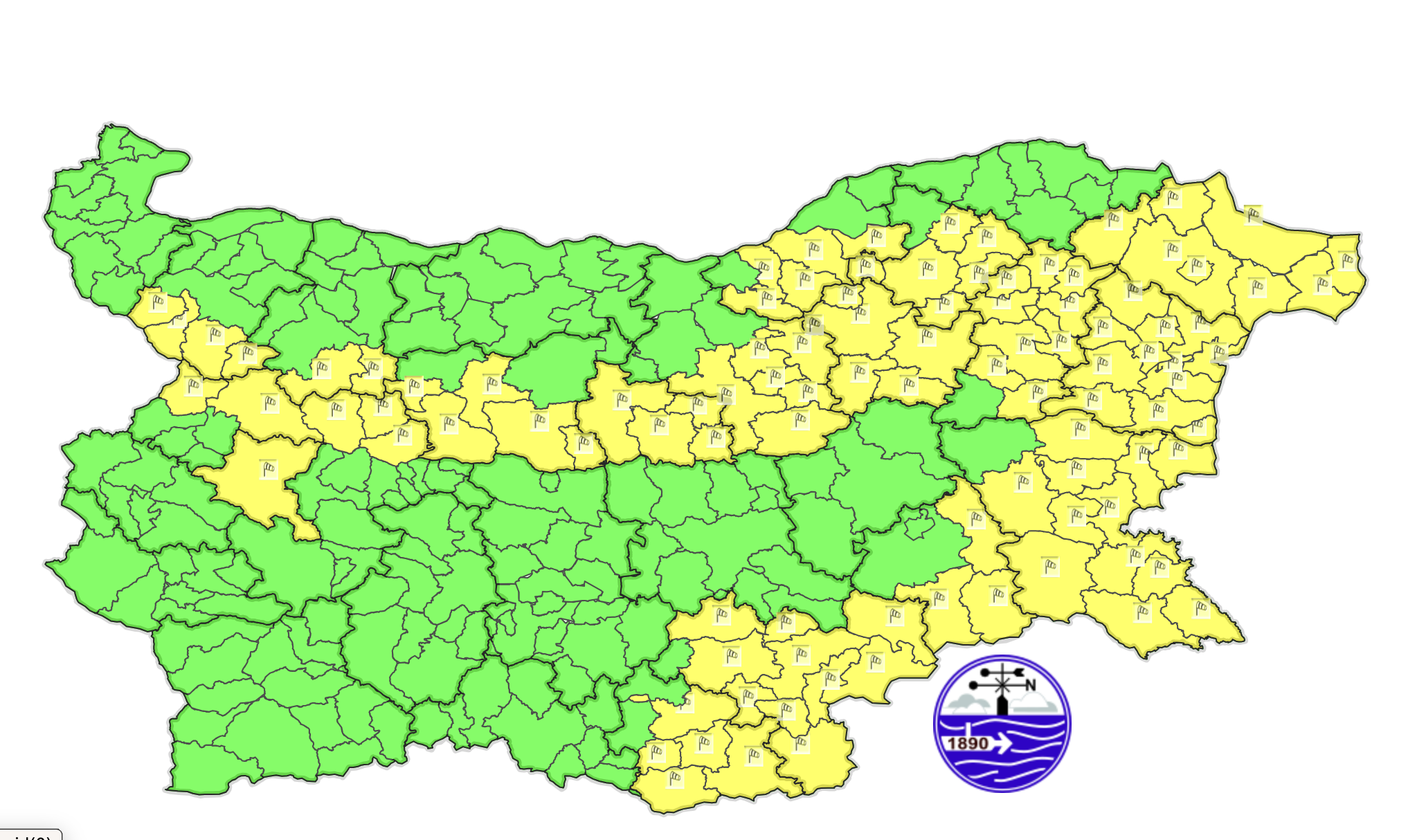 Жълт код за потенциално опасно време и силен вятър е обявен в половин България от синоптиците от Националния институт по метеорология и хидрология (НИМХ). Той е в сила за областите: Добрич, Варна, Бургас, Ямбол, Хасково, Кърджали, Шумен, Разград, Търговище, Русе, Велико Търново, Габрово, Ловеч, Враца, Монтана, София област и София град.