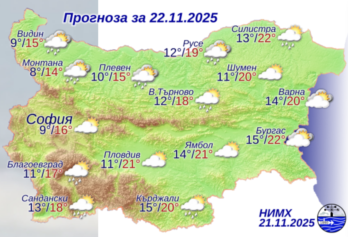 През деня ще има променлива облачност, по-значителна над северните райони, а след обяд и над югоизточните части от страната, където на места ще превали дъжд. Ще продължи да духа умерен, в Източна България и на север от планините и временно силен южен вятър. В Дунавската равнина вятърът ще се ориентира от запад и ще е слаб до умерен. Максималните температури ще бъдат между 14° и 19°, в югоизточните райони – до 22°, за София – около 16°.
