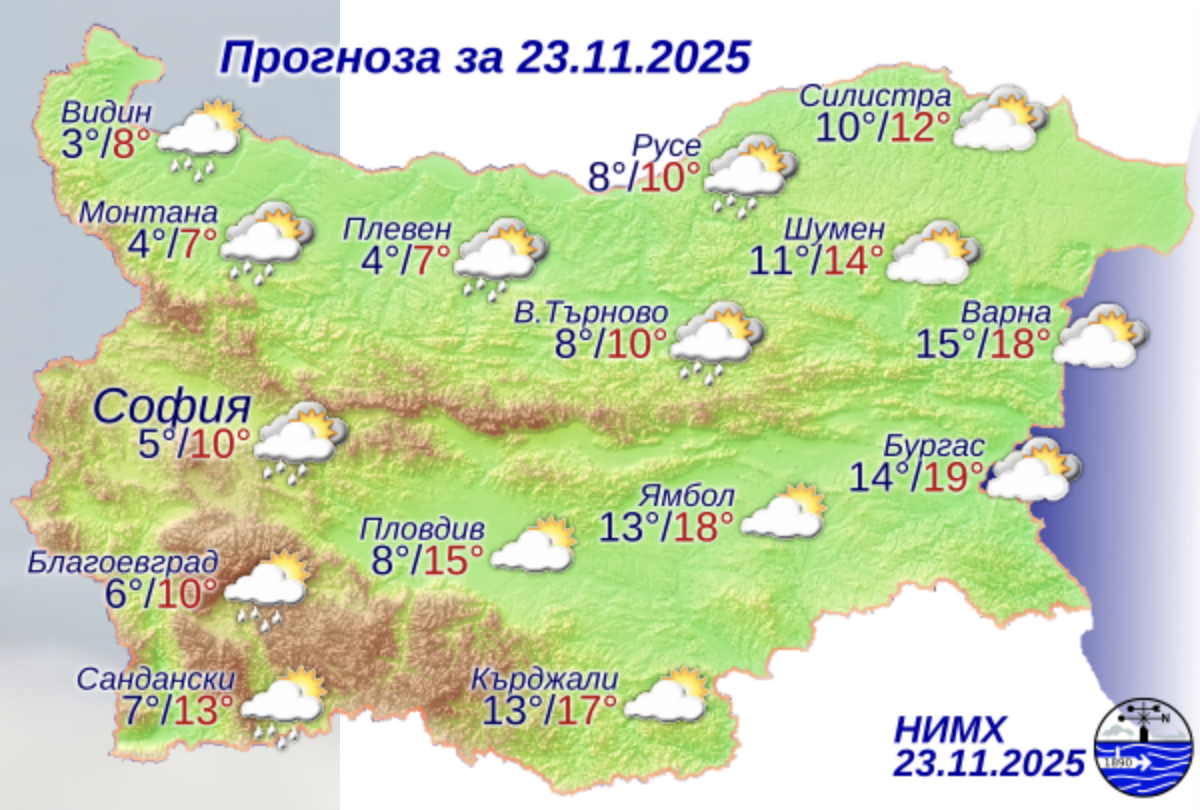 Сутринта ще бъде облачно. Дъжд ще вали в Западна и Централна Северна България. От северозапад в страната ще навлиза студен въздух. Минималните температури ще бъдат между 3° и 8°, в Източна България – между 10° и 15°, за София – около 5°. През деня над повечето райони ще се задържи предимно облачно. Отново на места в западната половина от страната с прекъсване ще вали дъжд, а през втората половина на деня и в Североизточна България. Над Южна България облачността ще се разкъсва и след обяд ще бъде предимно слънчево. В югоизточната част от страната вятърът ще се задържи умерен от юг-югозапад, а в останалата ще се ориентира от запад-северозапад и ще бъде до умерен. Максималните температури ще са от 6°-7° в северозападните райони до 18°-19° в югоизточните, за София – около 10°.