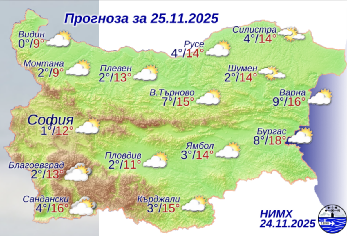 Днес над Югозападна и Източна България ще има разкъсана средна и висока облачност. Над останалата част от страната облачността временно ще намалее до слънчево. В сутрешните часове на места в равнинната част от страната видимостта ще е намалена. Вятърът от юг ще се усили. Почти тихо ще остане в Дунавската равнина и западните райони на Горнотракийската низина. Максималните температури ще са предимно между 10° и 15°. София – около 12°.