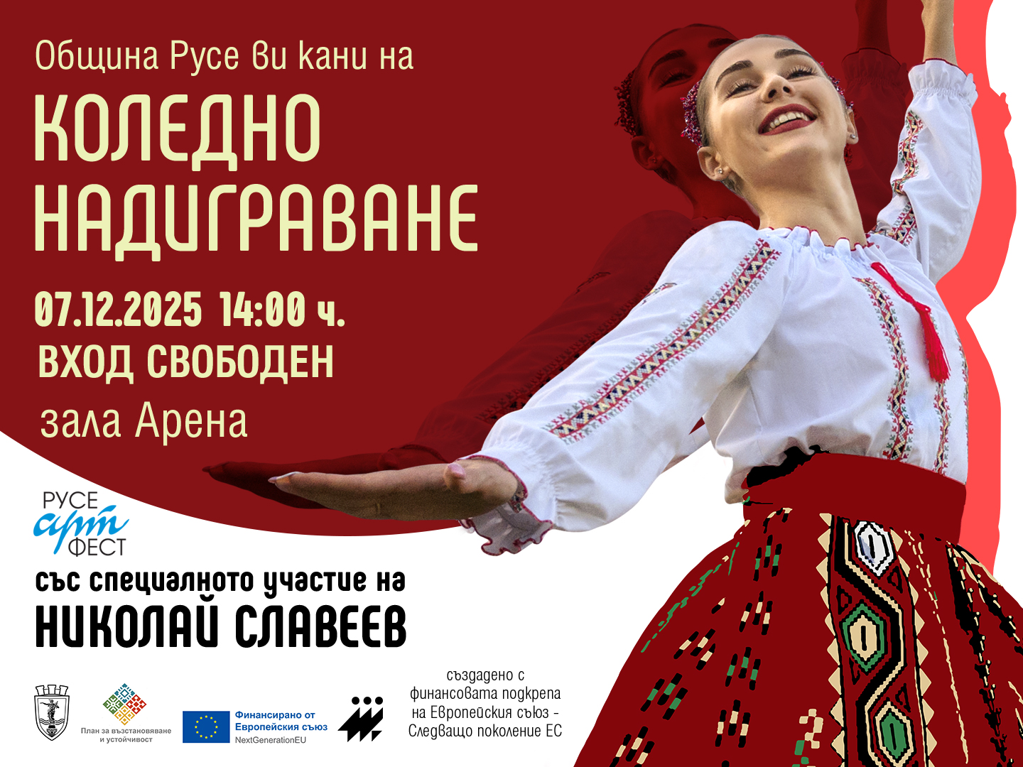 На 7 декември /неделя/ от 14 ч. за втора поредна година и при вход свободен в зала „Арена Русе“ ще се проведе традиционното Коледно надиграване. Звезда на тазгодишното издание на събитието ще бъде любимият народен изпълнител Николай Славеев, като специално за неговото представяне Танцова школа „Играорци“ ще подготви авторска премиерна хореография.