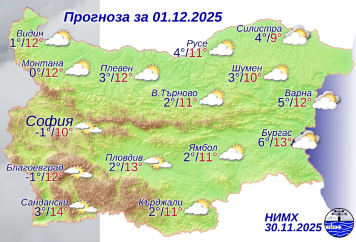 Днес още преди обяд облачността и над Североизточна България ще намалее и над страната ще се установи предимно слънчево време. В края на деня от запад ще се появи разкъсана висока облачност. Ще духа слаб вятър от запад-северозапад. Дневните температури слабо ще се повишат и преобладаващите максимални ще бъдат между 9° и 14°, в София – около 10°.
