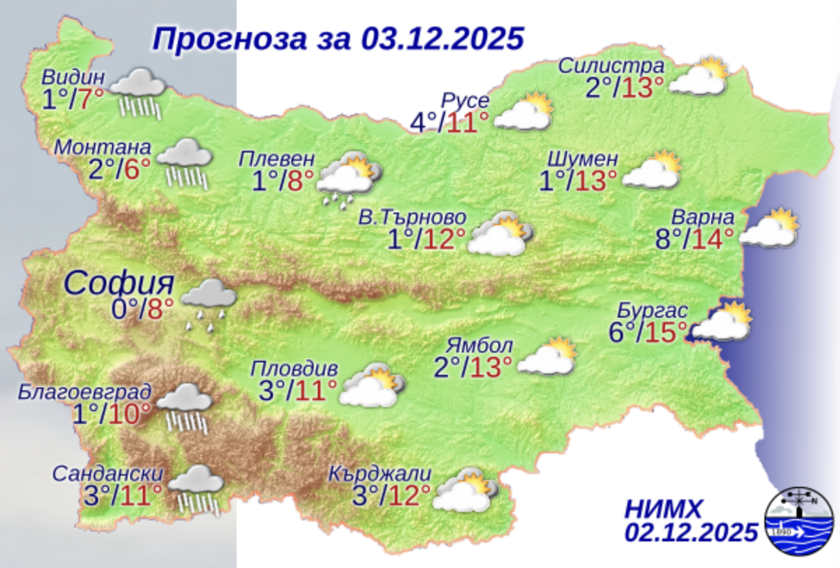 Днес в по-голямата част от страната ще бъде предимно облачно, главно след обяд и вечерта на места в Западна България ще превали дъжд. По-значителни разкъсвания и намаления на облачността ще има над Източна България. В сутрешните часове на места в низините, котловините и по долините на реките ще се образува мъгла. Ще духа слаб вятър от изток, в Източна България до умерен от юг-югоизток. Максималните температури ще бъдат между 9° и 14°, по-ниски в Северозападна България, в София – около 8°.