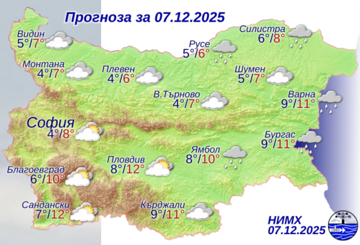 Днес ще бъде облачно, но само в крайните източни райони ще превалява дъжд. След обяд над Югозападна България и западните райони на Горнотракийската низина облачността ще се разкъсва и намалява. Ще духа до умерен вятър от север-североизток. Максималните температури ще са между 6° и 11°, в София – около 8°.