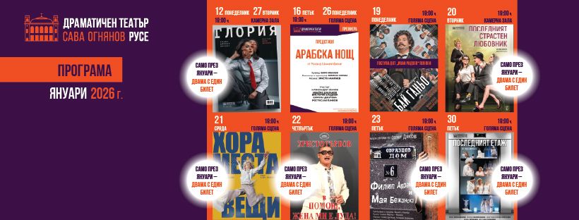 „Двама с един билет“ е януарската инициатива на Драматичен театър „Сава Огнянов“, която представлява специален жест към най-верните почитатели на театралното изкуство. Тази кампания предоставя възможност на зрителите да се насладят на магията на театъра заедно със свой близък човек, като същевременно се възползват от значителна финансова отстъпка.