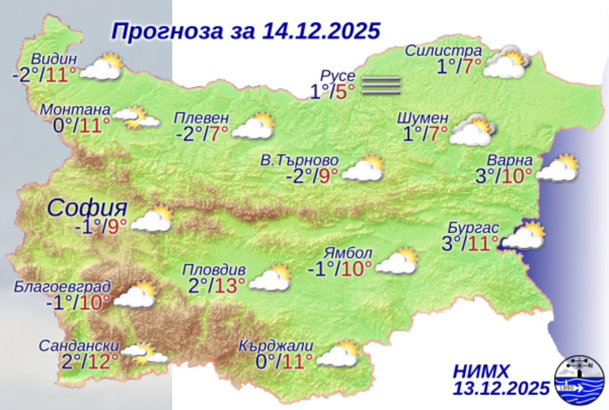 Днес преди обяд на много места в равнините и котловините ще е облачно и мъгливо, но след обяд, с появата на до умерен вятър от запад-северозапад, видимостта ще се подобрява. В останалата част от страната ще бъде предимно слънчево с максимални температури между 7° и 12°, по-ниски в местата с трайна мъгла, в София – около 9°.