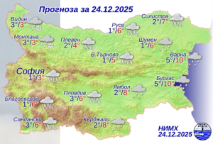 Днес ще бъде облачно, а валежите от дъжд ще обхванат западната половина от страната, а до вечерта и източните райони. Значителни по количество ще бъдат в Югозападна България и северозападните райони. След обяд и през нощта срещу Коледа, с понижението на температурите, на много места в Северозападна България, в Предбалкана и по високите западни полета дъждът ще премине в сняг. Ще духа умерен, по поречието на Дунав и източните райони временно силен североизточен вятър. Максималните температури ще са предимно между 3° и 8°, в София – около 3°.