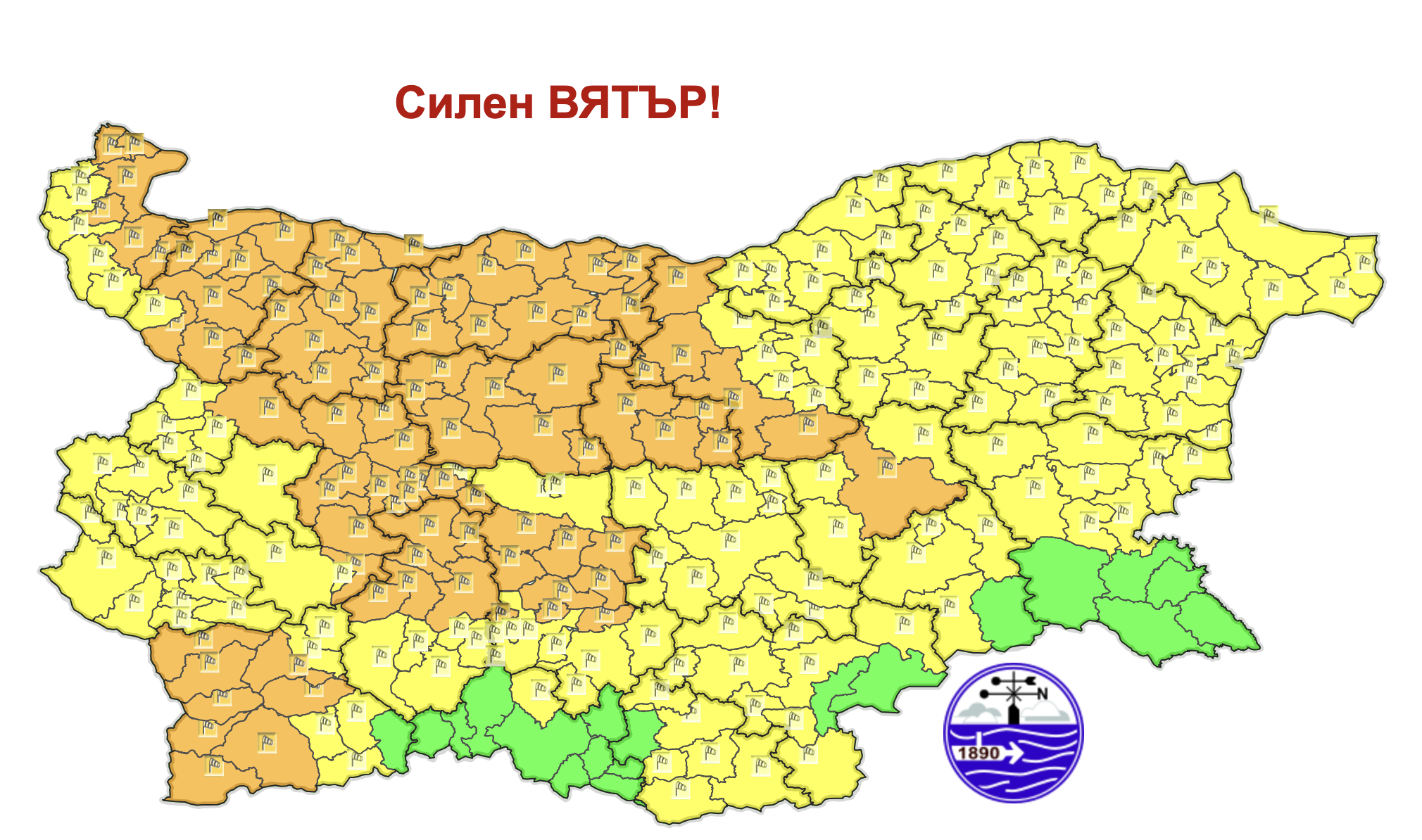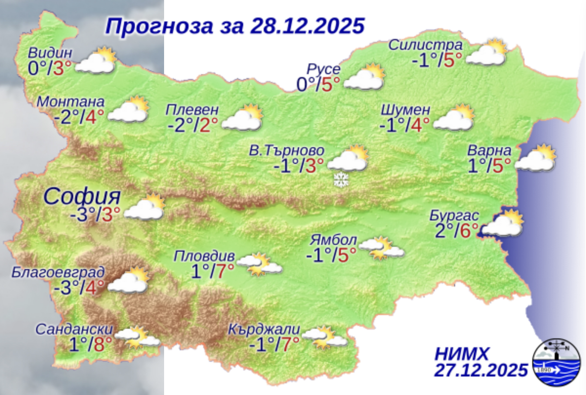 През нощта ще бъде предимно ясно, над Северна и Източна България с временни увеличения на облачността. Ще духа слаб, в Дунавската равнина умерен западен вятър, който ще започне да се усилва. Минималните температури ще бъдат предимно между минус 3° и 2°, в София – около минус 3°. През деня ще духа силен и бурен запад-северозападен вятър, с който ще нахлува студен въздух. Облачността ще бъде променлива, но само на отделни места, главно в Североизточна България, ще превали слаб сняг. Максималните температури ще бъдат между 2° и 7°, в София – около 3°.
