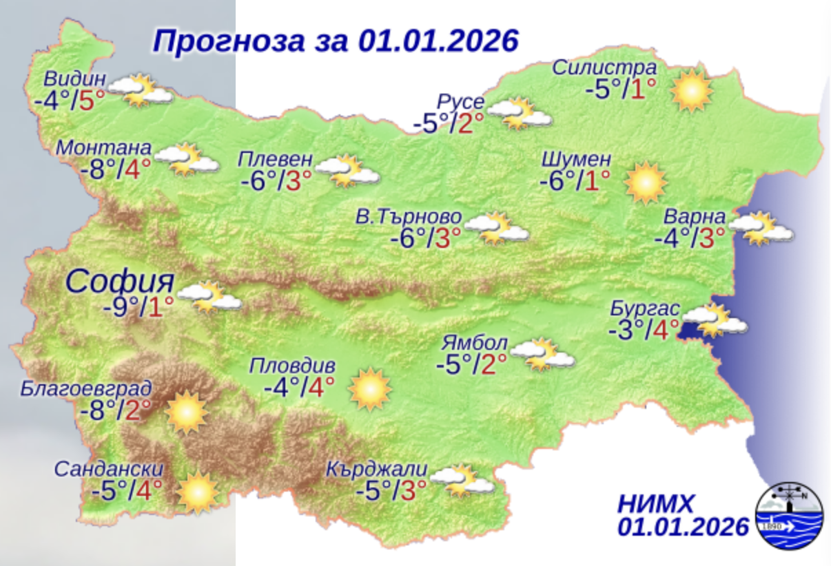 Днес ще бъде предимно слънчево. Вятърът ще бъде слаб и умерен от запад, но до вечерта ще се ориентира от югозапад и с него ще започне бързо затопляне. Максималните температури ще бъдат между 0° и 5°, в София – около 1°.
