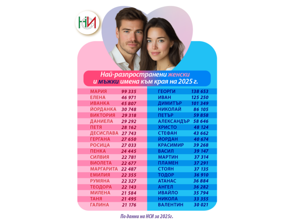 И през 2025 година най-често срещаните имена в България при мъжете и жените са Георги (138 653) и Мария (99 335). След тях остават Иван и Елена.